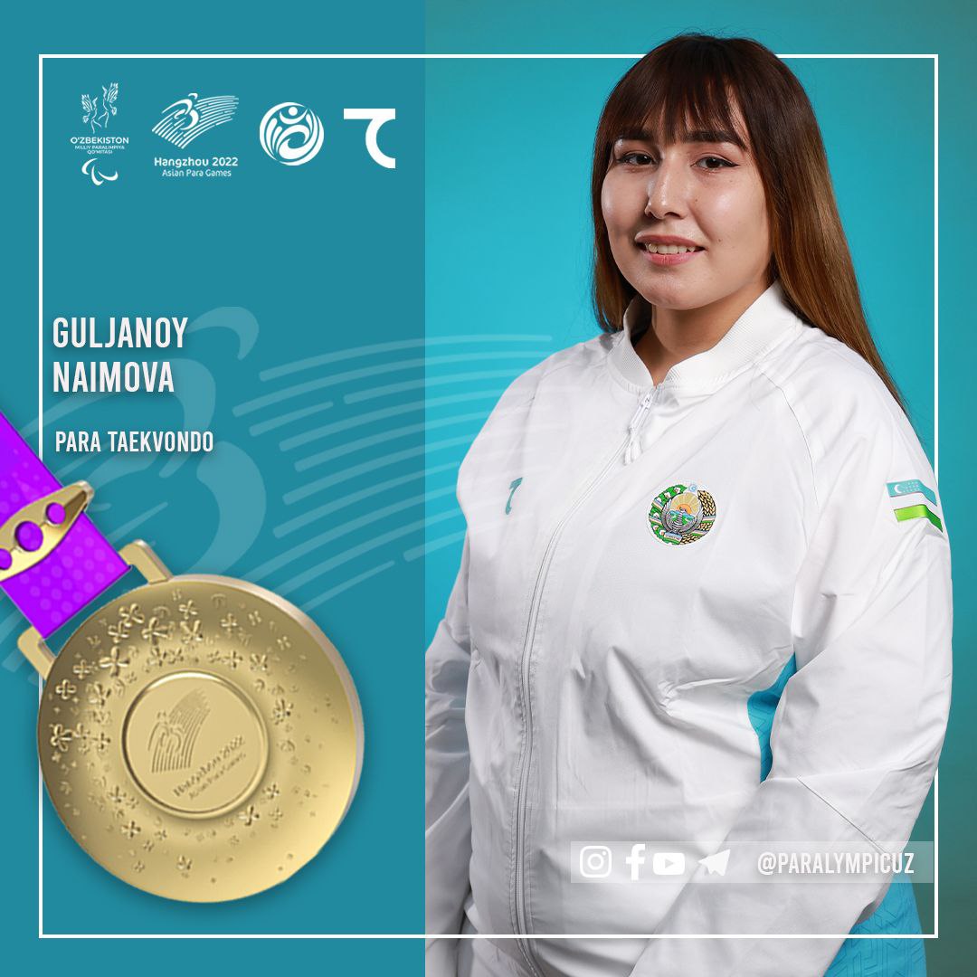 Пара-таэквондо бўйича Ўзбекистон терма жамоаси аъзоси Гулжаной Наимова ўз совринлари қаторига Пара Осиё ўйинларининг олтин медалини ҳам қўшиб қўйди. Аёллар ўртасида +65 кг вазн тоифасида иштирок этган ҳамюртимиз барча рақибларини мағлуб этган ҳолда мусобақа чемпионига айланди.