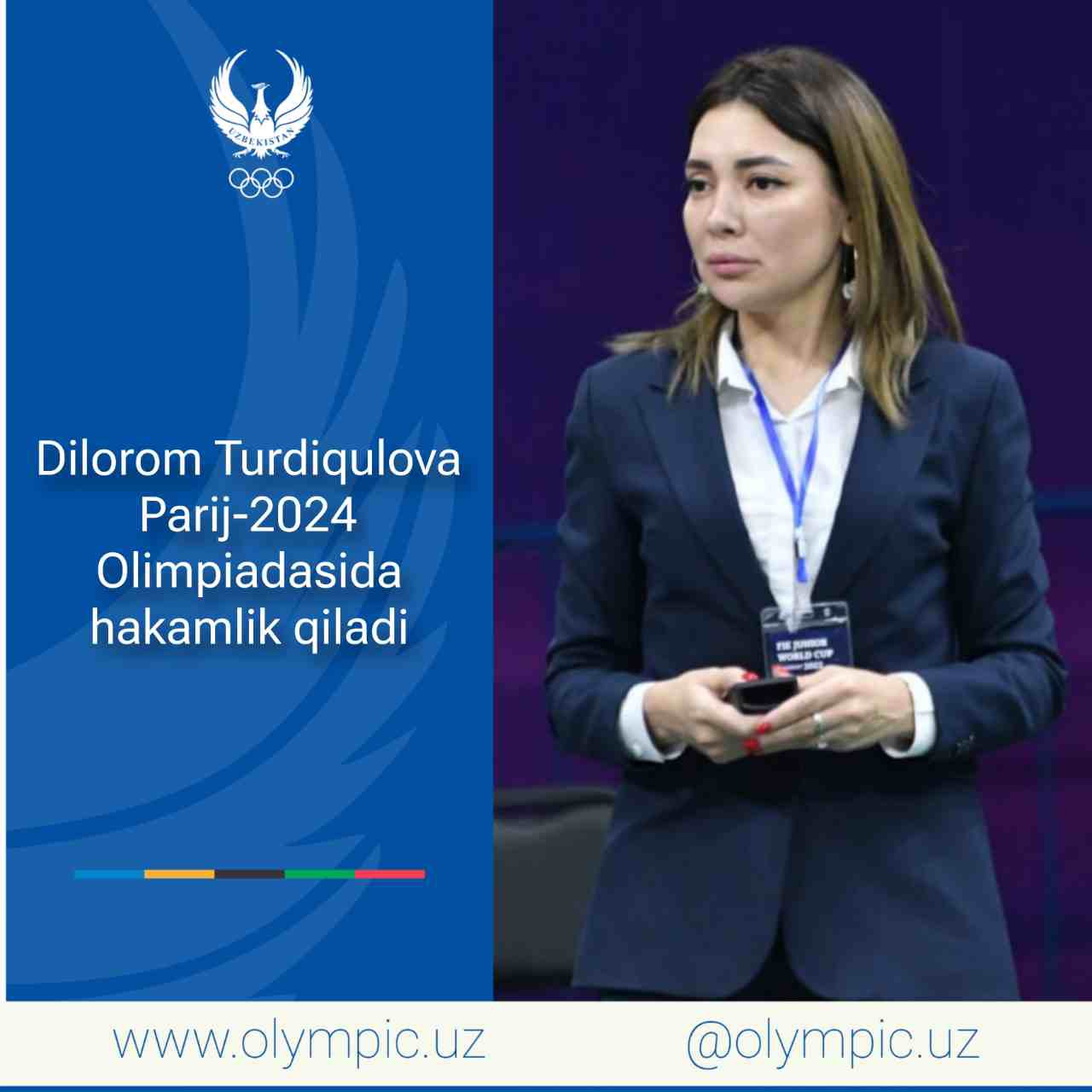 Халқаро қиличбозлик федерацияси Париж-2024 ёзги Олимпия ўйинларида ишлайдиган ҳакамлар рўйхатини эълон қилди. Қувонарлиси, улар орасида ҳамюртимиз, халқаро тоифадаги ҳакам Дилором Турдиқулова ҳам бор.