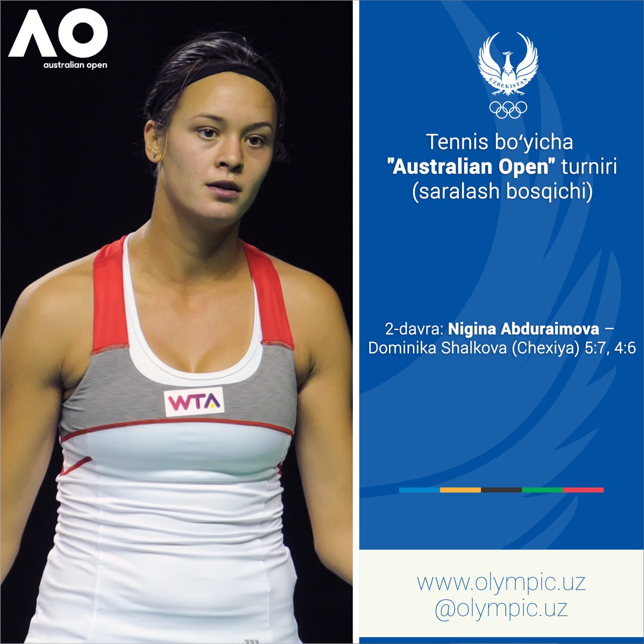 Нигина Абдураимова теннис бўйича “Катта дубулға” туркумига кирувчи Австралия очиқ чемпионати (Australian Open)даги иштирокини якунлади. Ҳамюртимиз саралаш босқичининг иккинчи даврасида чехиялик Доминика Шалковага имкониятни бой берди.
