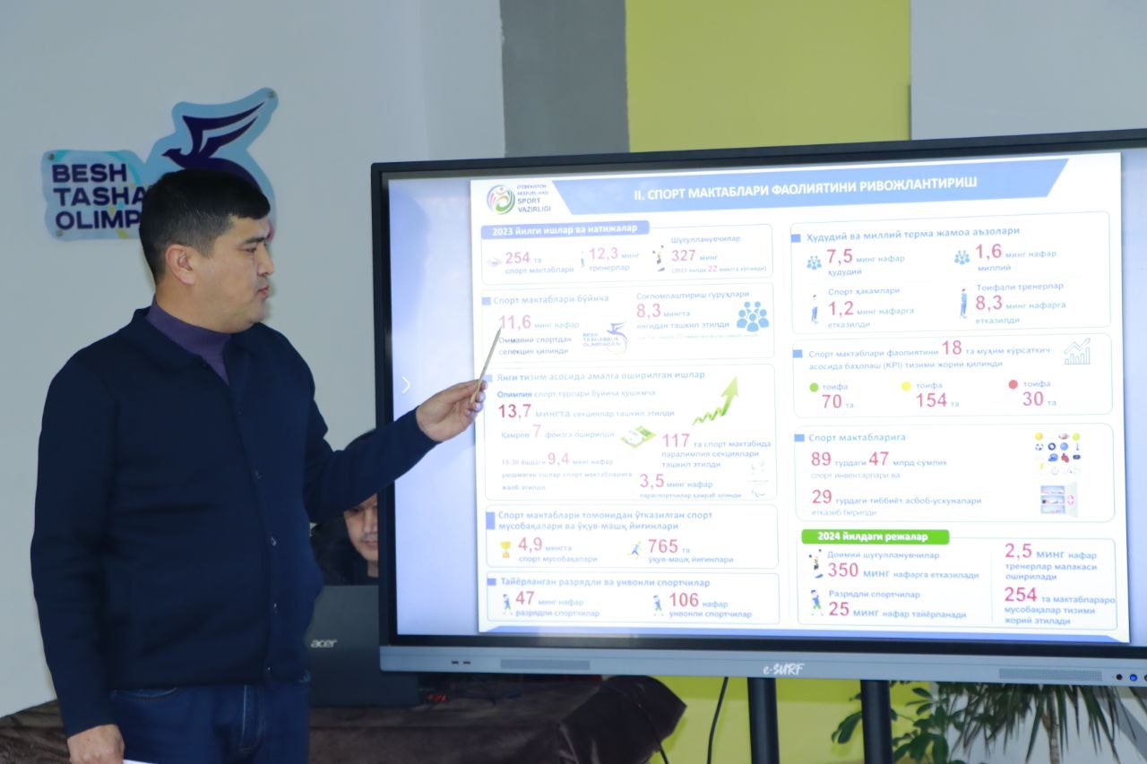 Шунингдек, Гулистондаги “Алпомиш” спорт мажмуаси, сув спорти, гимнастика, яккакураш ва спортнинг ўйин турлари бўйича ихтисослаштирилган спорт мактаблари фаолияти ўрганилиб, у ерда спортчиларга яратилган шарт-шароитлар билан танишилди. Шундан сўнг, 2023 йил давомида Гулистон Олимпия ва Паралимпия спорт турларига тайёрлаш марказида эришилган ютуқлар ҳамда 2024 йилги режалар тақдимоти кўриб чиқилди.