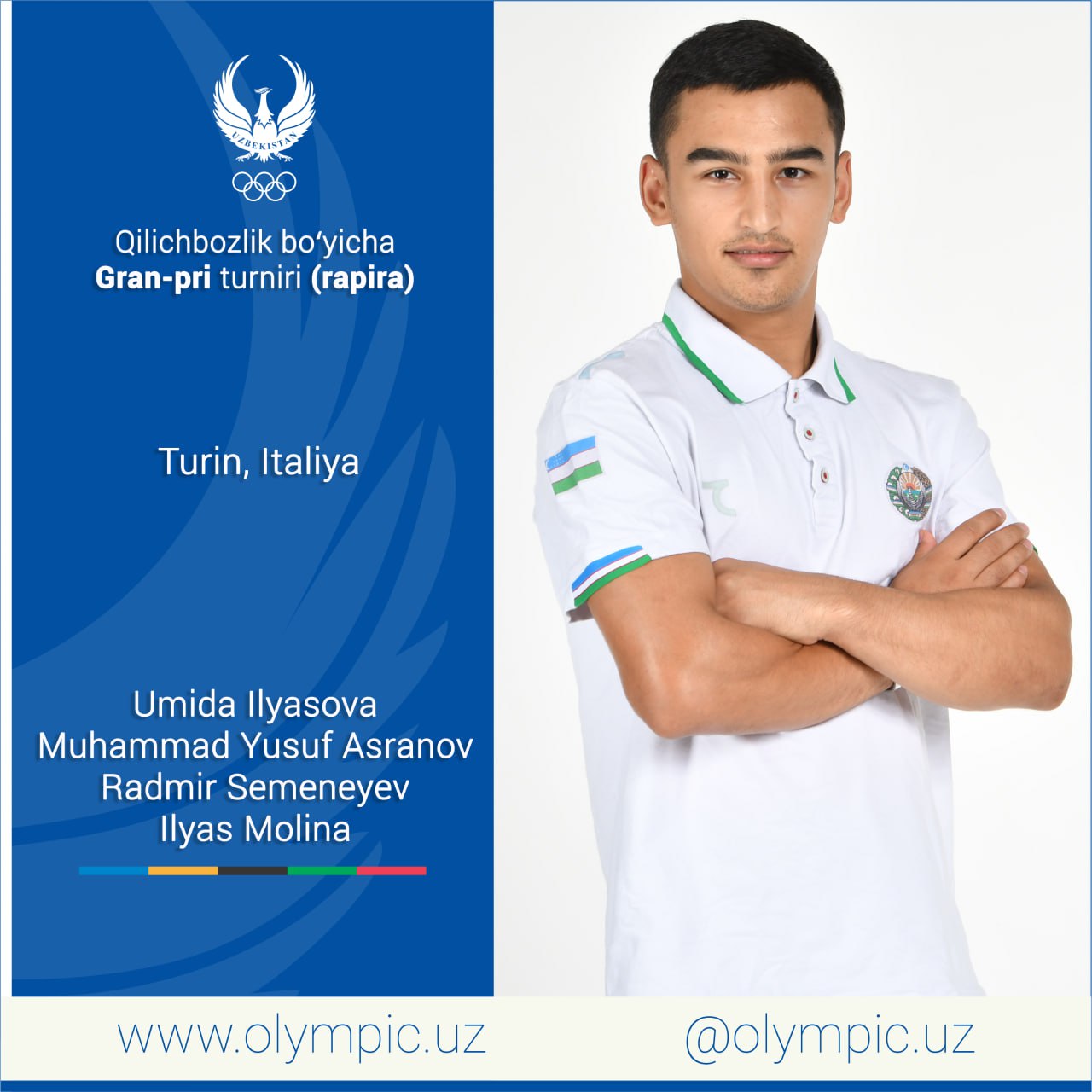 Шунингдек, рапирачилар Италияда ўтадиган Гран-при турнирида қатнашадилар. Мураббийлар штаби мазкур турнир учун қизларимиздан Умида Ильясова, йигитларимиздан Муҳаммад Юсуф Асранов, Радмир Семенеев ҳамда Ильяс Молинани танлаб олишган. Дастурга кўра, мазкур мусобақада аёллар ўртасидаги саралаш баҳслари бугун, эркаклар тоифасидаги беллашувлар эса эртадан бошланади.