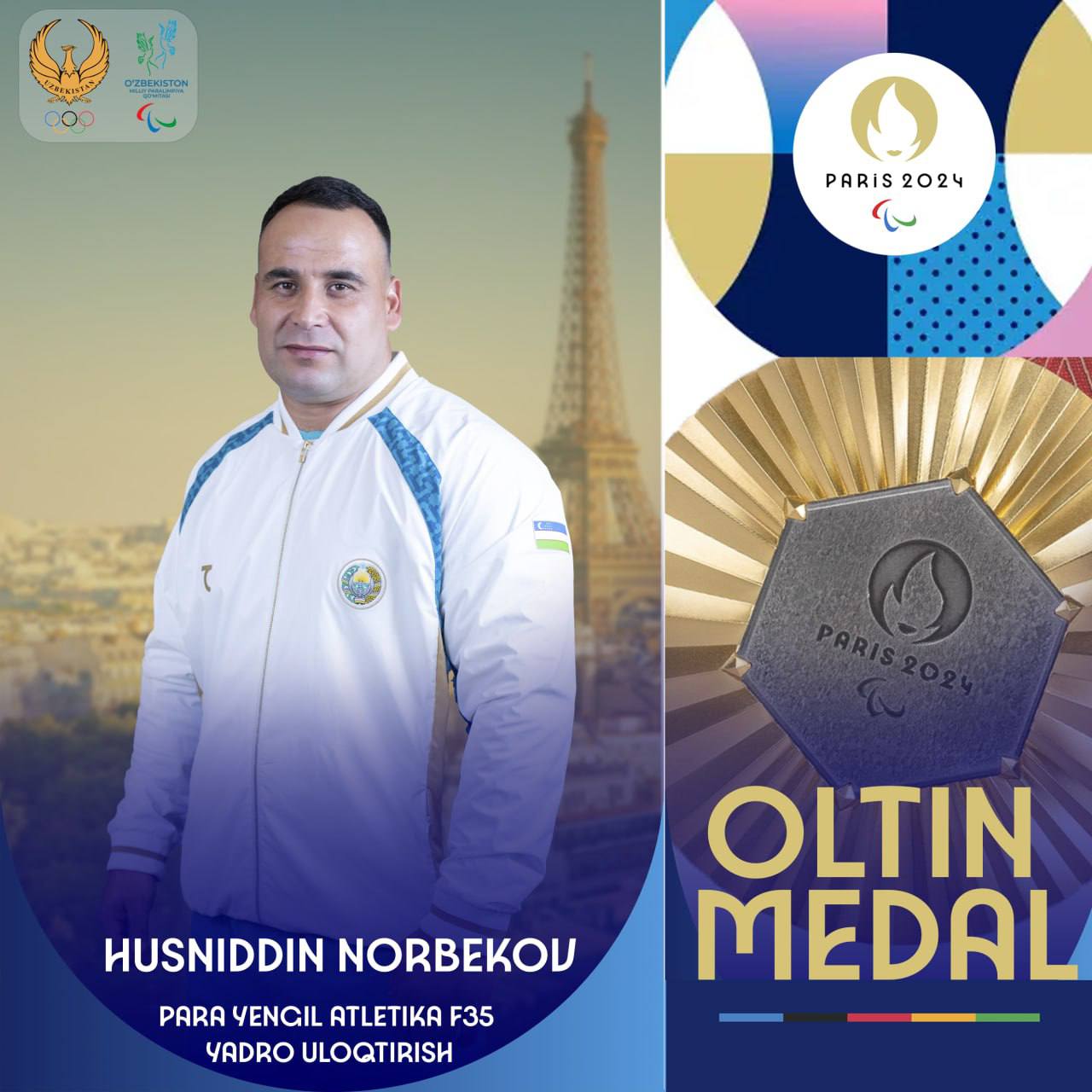 Париж-2024 ёзги Паралимпия ўйинларининг бугунги куни делегациямиз учун муваффақиятли ўтмоқда. Номдор пара атлетимиз Ҳусниддин Норбеков Ўзбекистон делегациясига саккизинчи олтин медални тақдим қилди.