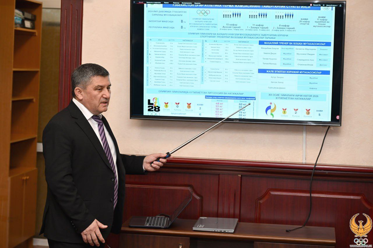 Шундан сўнг Ўзбекистон енгил атлетика федерациясининг тақдимоти муҳокама қилинди. Қайд этиш жоиз, Олимпия ўйинларида энг кўп йўлланма ва медаллар жамланмаси айнан ушбу спорт турида ўйналади. Бироқ терма жамоамиз сўнгги пайтларда саноқли лицензиялар билан чекланиб қолмоқда.