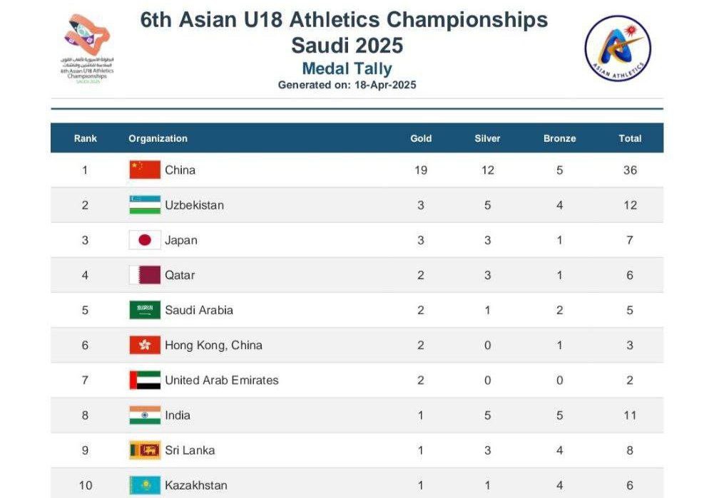 Саудия Арабистонининг Даммам шаҳрида енгил атлетика бўйича U18 ёш тоифасидаги Осиё чемпионати ўз якунига етди. Унда қатнашган Ўзбекистон терма жамоаси 3 та олтин, 5 та кумуш ва 4 та бронза медаллари билан умумжамоа ҳисобида иккинчи ўринни эгаллади. Бу билан ёшларимиз илк бор қитъа чемпионатида иккинчи натижани қайд этишди.