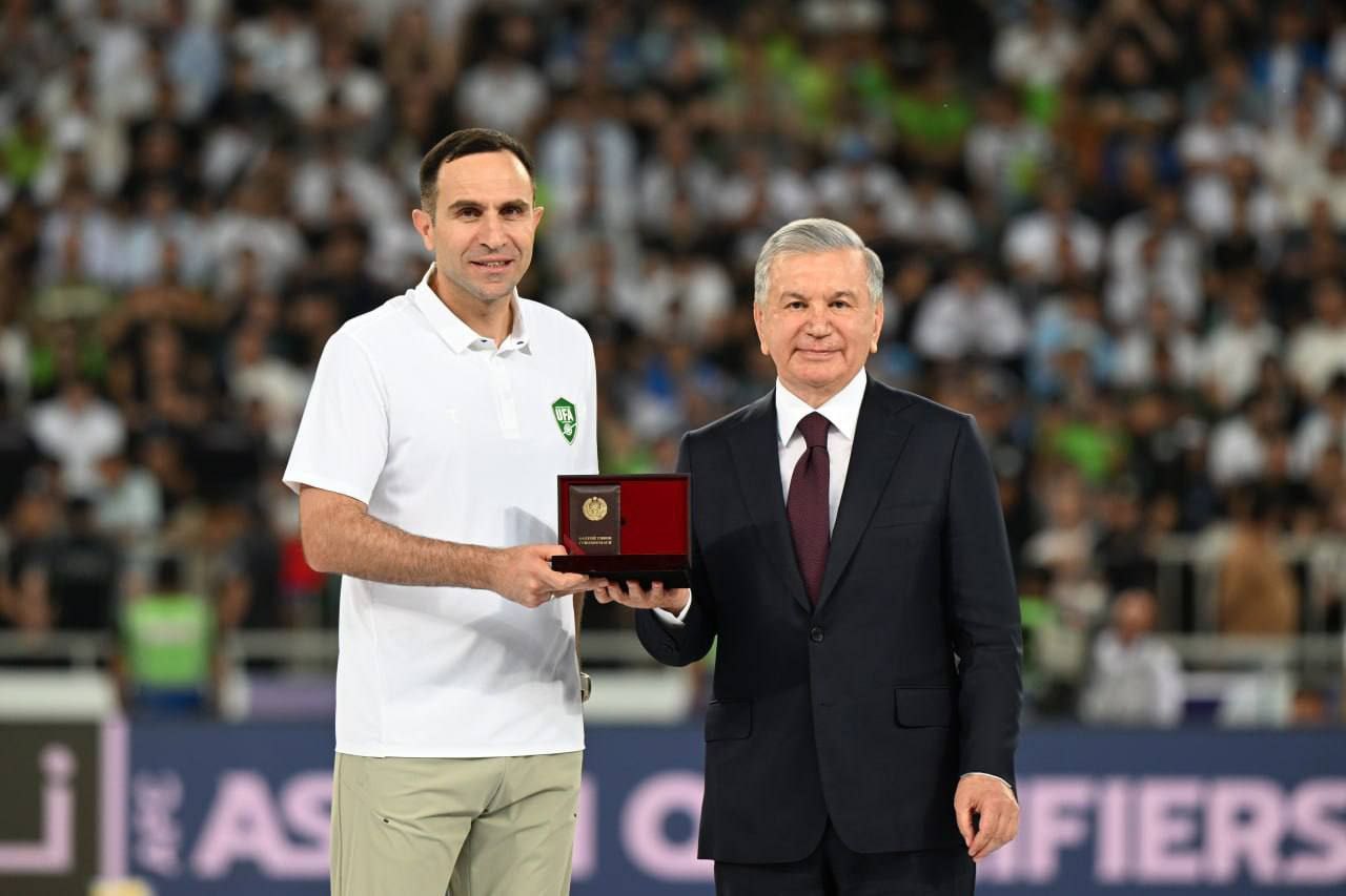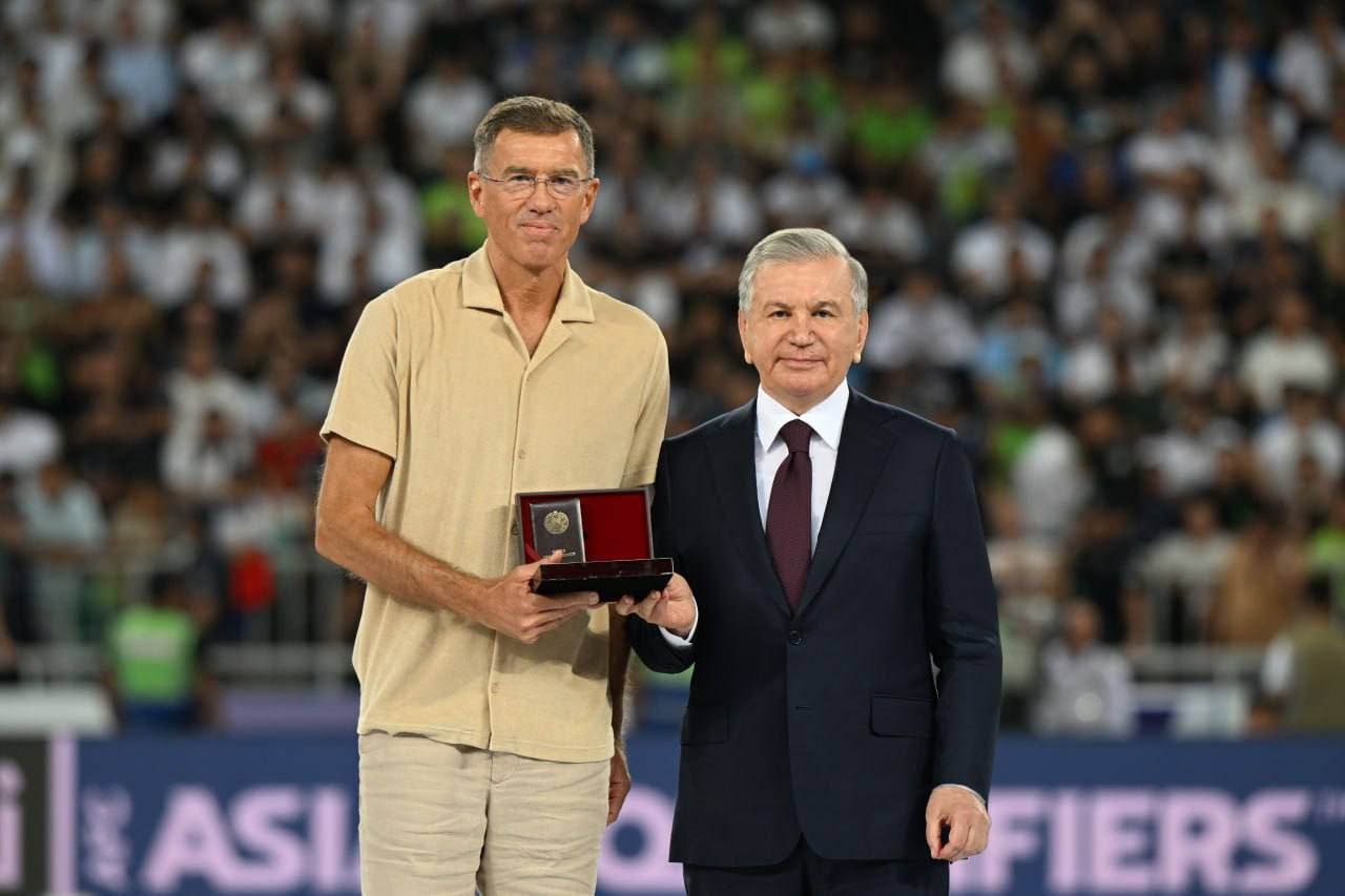 Ўзбекистон Республикаси Президентининг 6 июндаги фармонига мувофиқ, Ватанимиз тарихида биринчи марта жаҳон чемпионати йўлланмасини қўлга киритгани, ёш авлодни спортга меҳр ва миллий ғурур руҳида тарбиялашга қўшган ҳиссаси учун футбол бўйича Ўзбекистон миллий терма жамоаси аъзолари ва мураббийларидан бир гуруҳи мукофотланган эди. Ўйиндан кейин ушбу мукофотларни топшириш маросими бўлди. Давлатимиз раҳбари қаҳрамон спортчиларимизга фахрий унвон, орден ва медалларни топширди. Шунингдек, терма жамоамиз аъзолари ва мутахассисларига BYD автомобиллари совға қилинди.