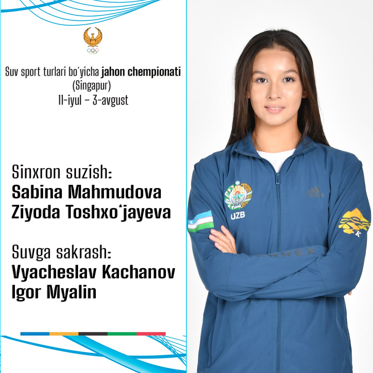 11 июль – 3 август кунлари Сингапурда сув спорти турлари бўйича жаҳон чемпионати бўлиб ўтади. Мазкур нуфузли мусобақада Ўзбекистон терма жамоаси аъзолари ҳам бир қатор дастурларда баҳс олиб боришади. Узбекистан ақуатисс федерациясининг маълум қилишича, дунё биринчилигида терма жамоамиз қуйидаги таркибда иштирок этади:
