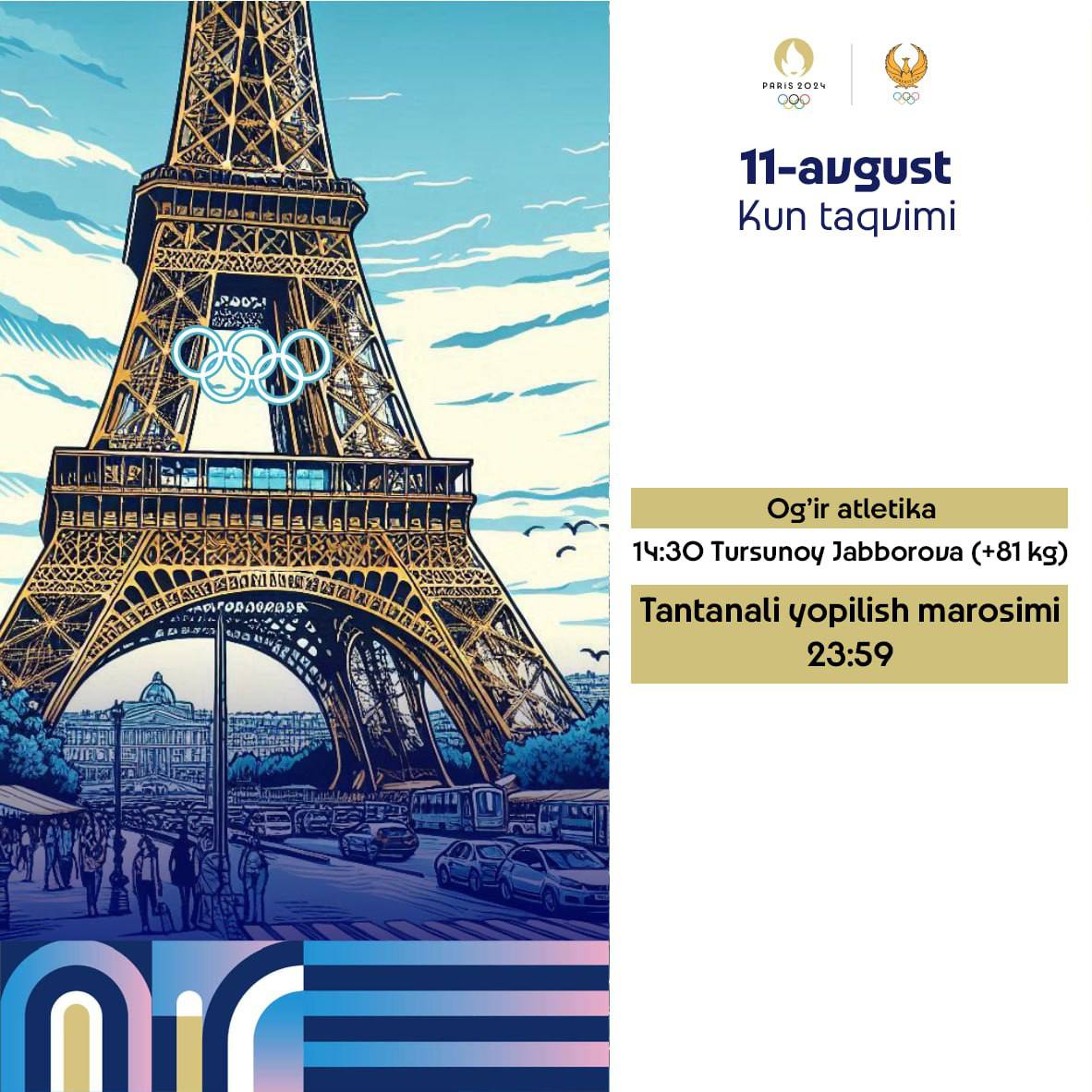 Бугун Париж-2024 XXXIII ёзги Олимпия ўйинлари ўз ниҳоясига етади. Спортчиларимизнинг тарихий Олимпиа...