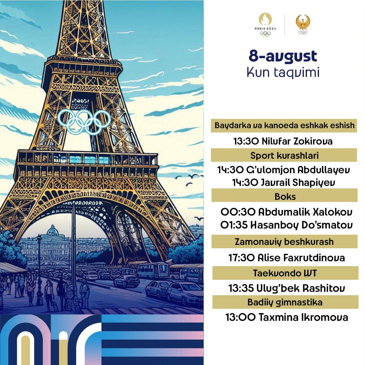 Каноэчимиз Нилуфар Зокирова Париж-2024 ёзги Олимпия ўйинларидаги иштирокини тугатди. Чорак финалда с...