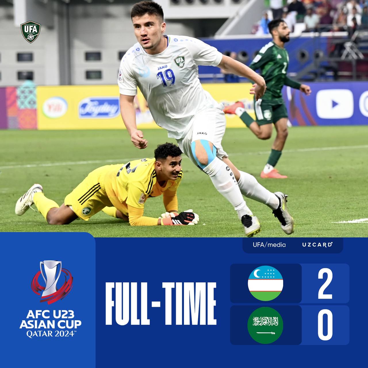 Футбол бўйича U23 Осиё кубоги, 1/4 финал Ўзбекистон 2 – 0 Саудия Арабистони Ҳ.Норчаев 45+2ʼ, У....