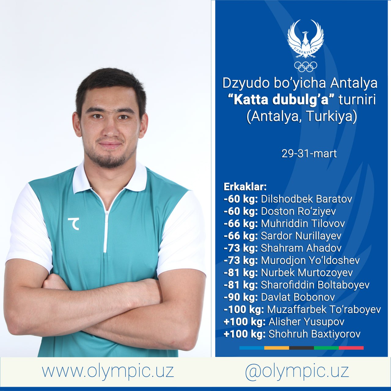 29-31 март кунлари Туркиянинг Анталья шаҳрида дзюдо бўйича “Катта дубулға” турнири бўлиб ўтади. Ушбу...