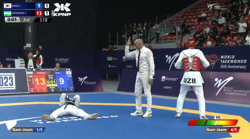 -74 кг вазн тоифасида иштирок этаётган Жасур Жайсуновнинг кореялик Жаегвон Канг билан жанги мусобақа...