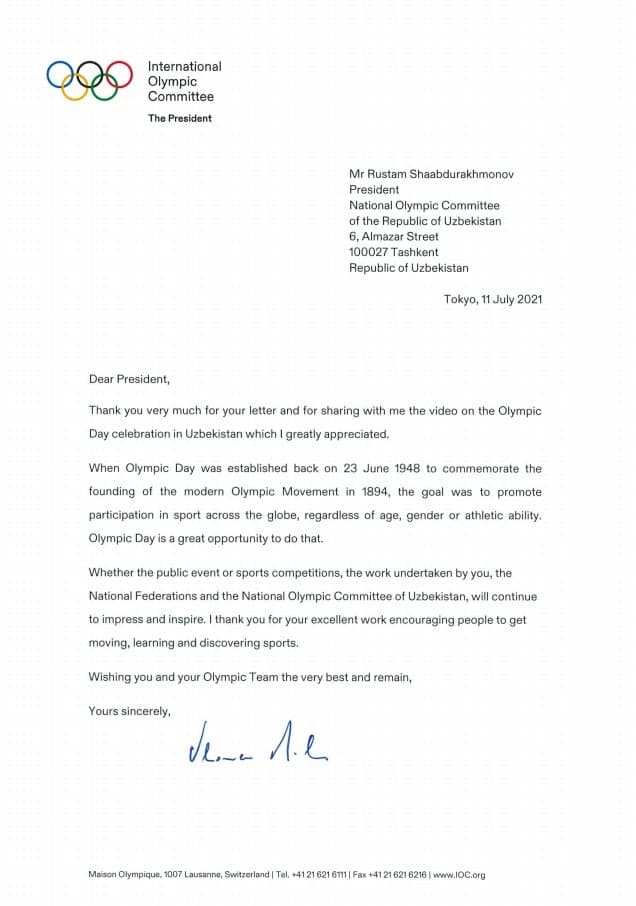As you know, on June 21-28, in honor of the "International Olympic Day", the Olympic Week was held throughout Uzbekistan, and festive events were organized in many parts of the country. The video, which captures the events held in 15 sports federations and associations of the Republic, was handed over to the President of the International Olympic Committee, Thomas Bach. In turn, Bach noted that the holiday in Uzbekistan was held at a high level and sent a letter of thanks to the chairman of the NOC of Uzbekistan: