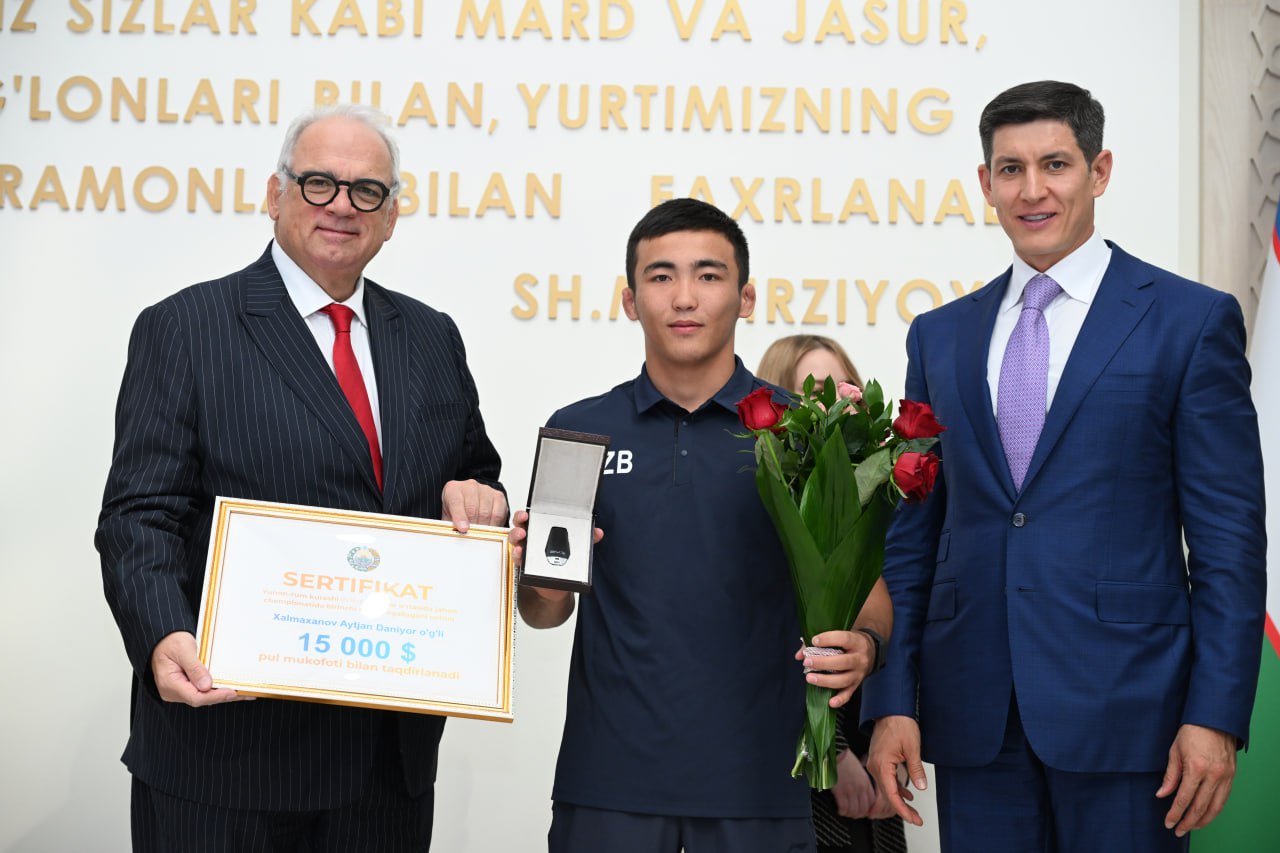 In recognition of his historic Greco-Roman world title — the first for Uzbekistan in 24 years — Aytzhan Khalmakhanov was presented with a BYD car as a gift from the President.