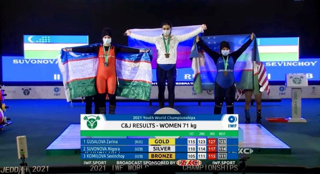 Saudiya Arabistonida o‘tkazilayotgan og‘ir atletika bo‘yicha o‘smirlar o‘rtasidagi jahon chempionatining ortda qolgan kuni qizlarimiz uchun muvaffaqiyatli o‘tdi. -71 kg vazn toifasida ishtirok etgan Nigora Suvonova hamda Sevinchoy Komilova 4 ta medalga sazovor bo‘lishdi.
