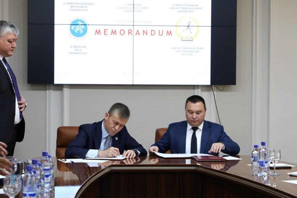O‘zbekiston Davlat Jismoniy tarbiya va sport universiteti, O‘zbekiston yilqichilik va ot sporti, zamonaviy beshkurash va polo federatsiyalari, Sport ilmiy tadqiqotlar instituti o‘rtasida ot sportini yanada takomillashtirishda o‘quv-mashg‘ulot yig‘inlari, ilmiy-uslubiy va innovatsion texnologiyalarni joriy etish maqsadida hamkorlik memorandumi imzolandi.