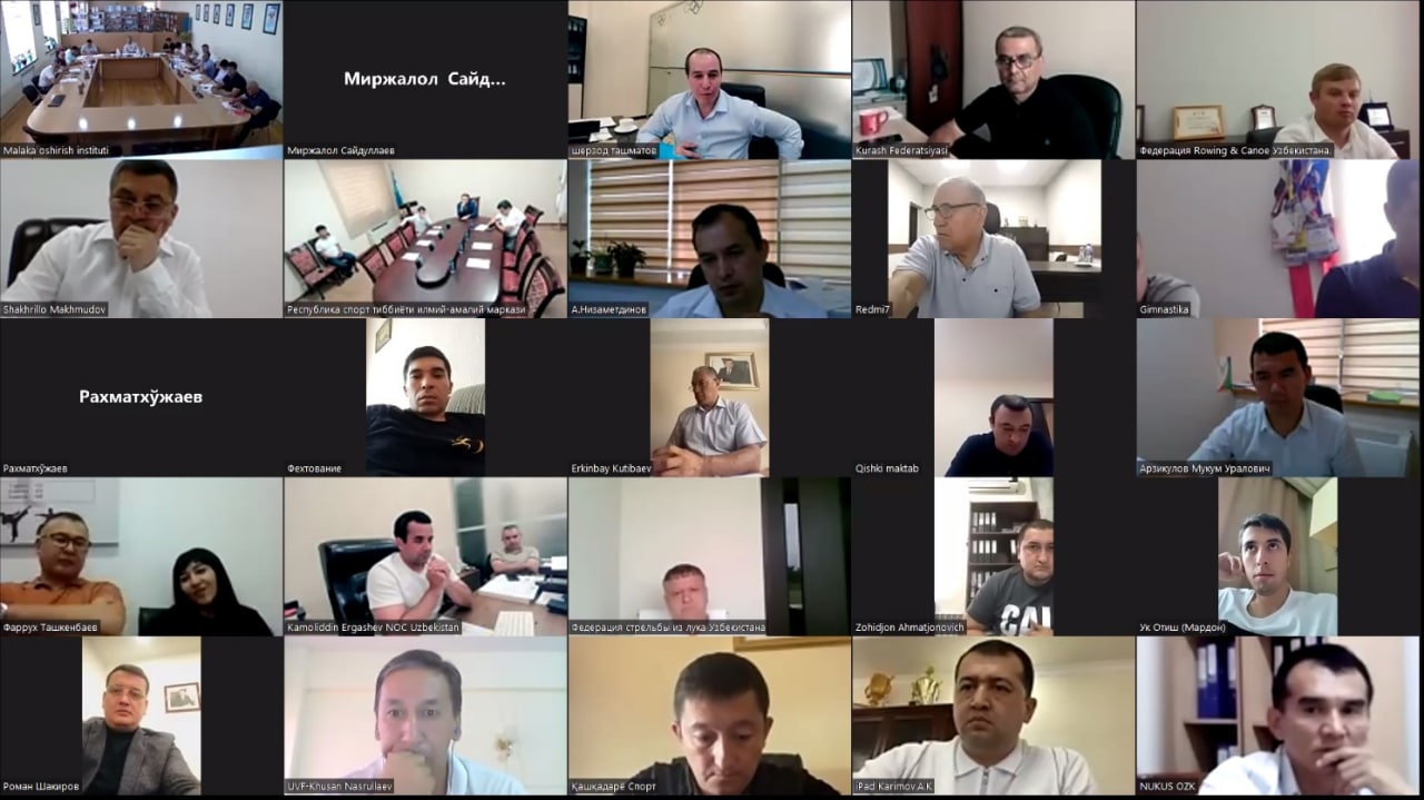 Sportni rivojlantirish vazirligi, Milliy Olimpiya qoʻmitasi va uning qoshidagi Respublika sport tibbiyoti ilmiy-amaliy markazi (RSTIAM), sport federatsiya va assotsiatsiyalari mutasaddilari ishtirokida onlayn yigʻilish boʻlib oʻtdi. ZOOM platformasida oʻtgan tadbirda terma jamoalarimizning hozirgi holati, oldinda turgan kompleks musobaqalarga tayyorgarlik jarayoni muhokama qilindi.