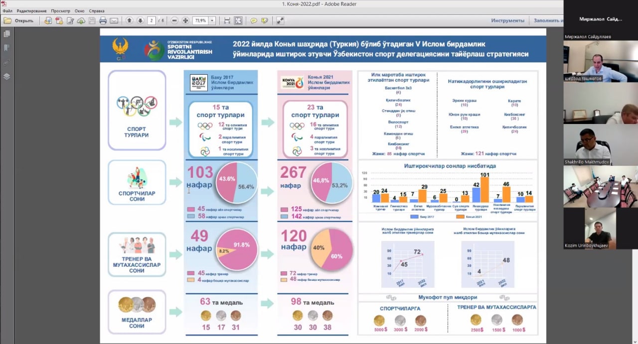 Shundan soʻng MOQ raisi oʻrinbosari Sherzod Tashmatov bir yilga kechiktirilgan Konya-2021 V Islom birdamligi oʻyinlariga tayyorgarlik jarayoni boʻyicha gapirdi. Sherzod Rixsibayevich oʻz nutqida hukumatimiz va xalqimiz boʻlajak musobaqada sportchilarimizdan ulkan natija kutayotganini inobatga olib, unga jiddiy tayyorgarlik olib borish lozimligini alohida taʼkidladi. Shuningdek, u masʼullarga har bir jamoaning musobaqagacha boʻlgan oʻquv-mashgʻulot yigʻinlarining rejasini yana bir karra koʻrib chiqish, uni takomillashtirish boʻyicha oʻz tavsiyalarini berdi.