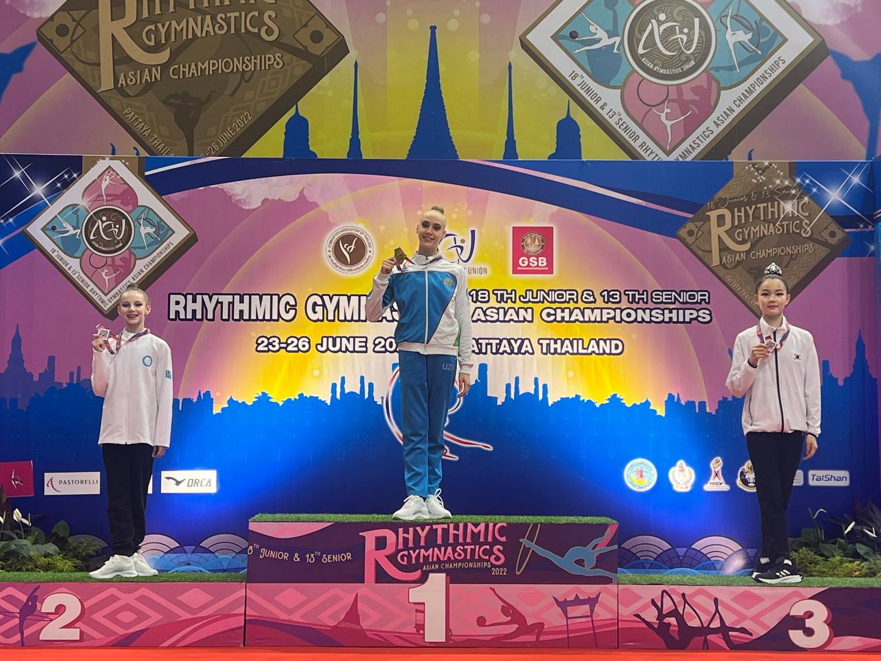 Shahzoda Ibragimova, Nargiza Jumaniyozova, Nilufar Aʼzamova, Mumtoza Isʼhoqzoda, Xurshida Abduraufova va Mariya Pakdan iborat jamoamizning 5 halqada bajargan chiqishi kumush medalga loyiq koʻrildi. Anastasiya Saransovaning toʻp bilan, yoshlar jamoamizning (Domenika Damirova, Viktoriya Neskubo, Irodaxon Sodiqova, Diyora Baxtiyorova, Mubina Kamolova va Yasmin Amira Mirzayarova) arqon bilan ijro etgan dasturi esa bronza medallarini keltirdi.