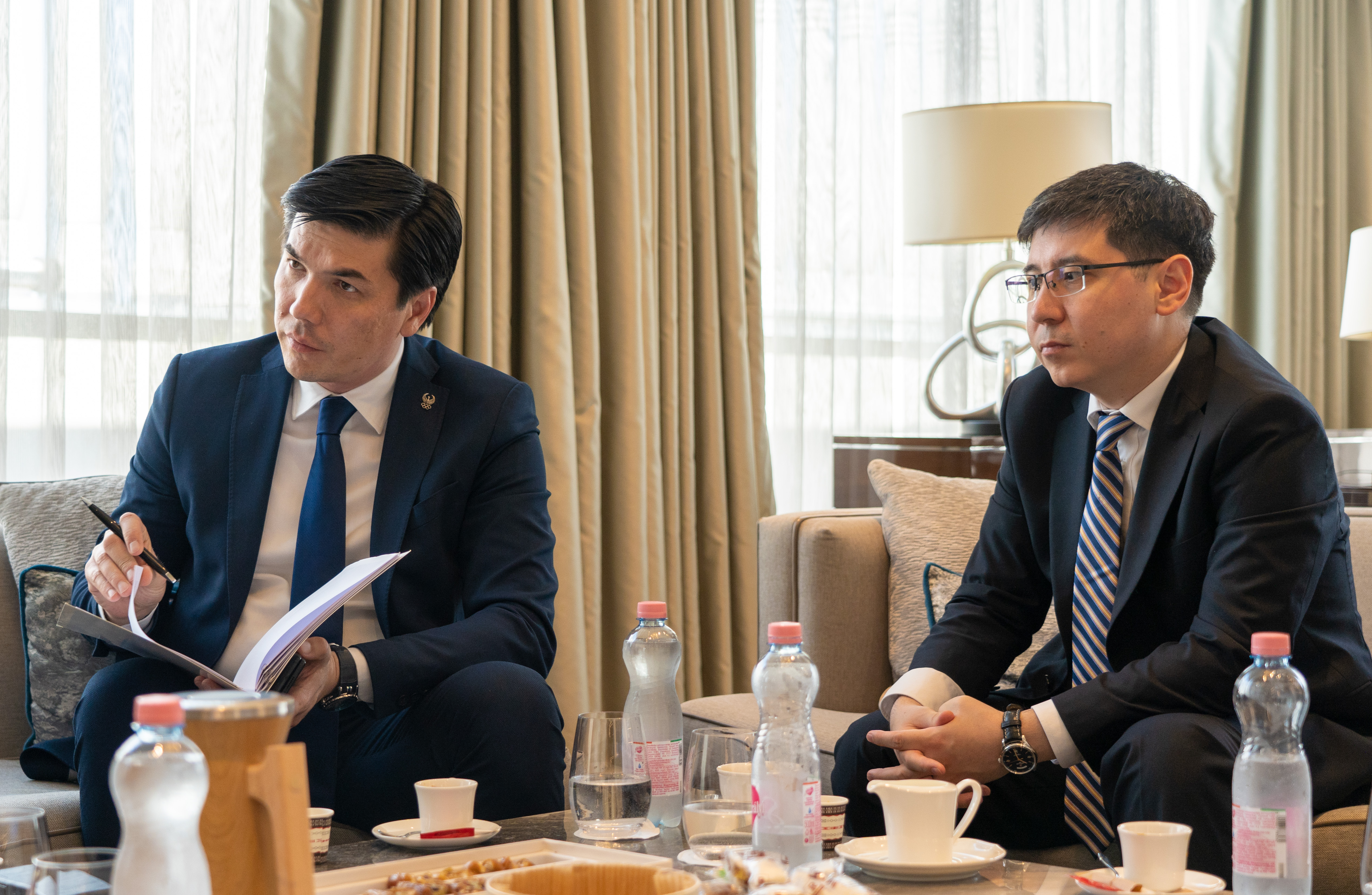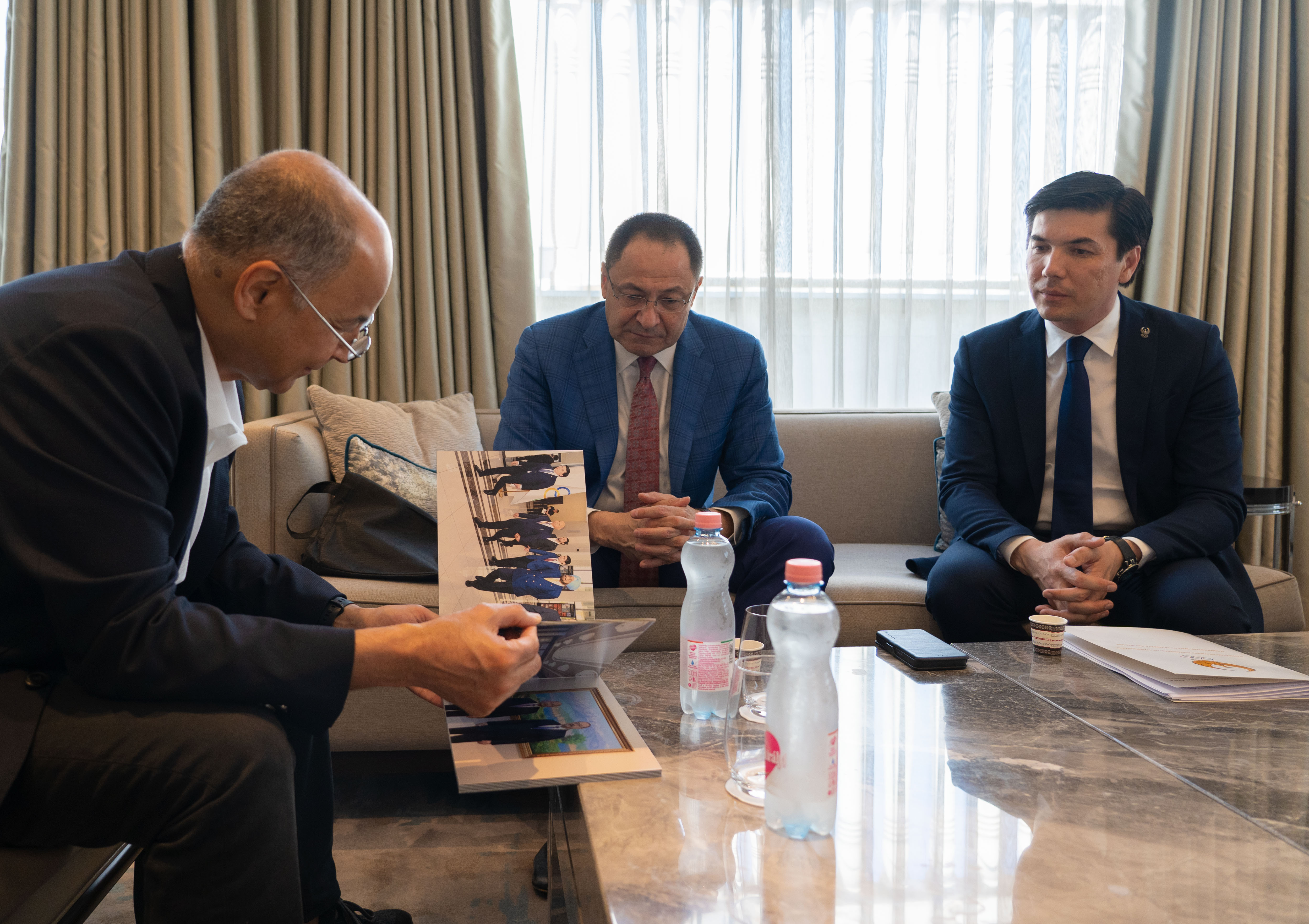 Mutasaddilar dastlab suv polosi boʻyicha bugungi dasturdan oʻrin olgan bellashuvlarni kuzatish barobarida FINA prezidenti, Osiyo Olimpiya kengashi Bosh direktori Husayn Al Musallam bilan uchrashuv oʻtkazdilar. Unda tomonlar oʻrtasidagi hamkorlik aloqalarini yangi bosqichga olib chiqish, FINA shafeʼligida oʻtadigan seminarlarda oʻzbekistonlik mutaxassislarga grantlar ajratish kabi mavzular kun tartibidan oʻrin oldi.