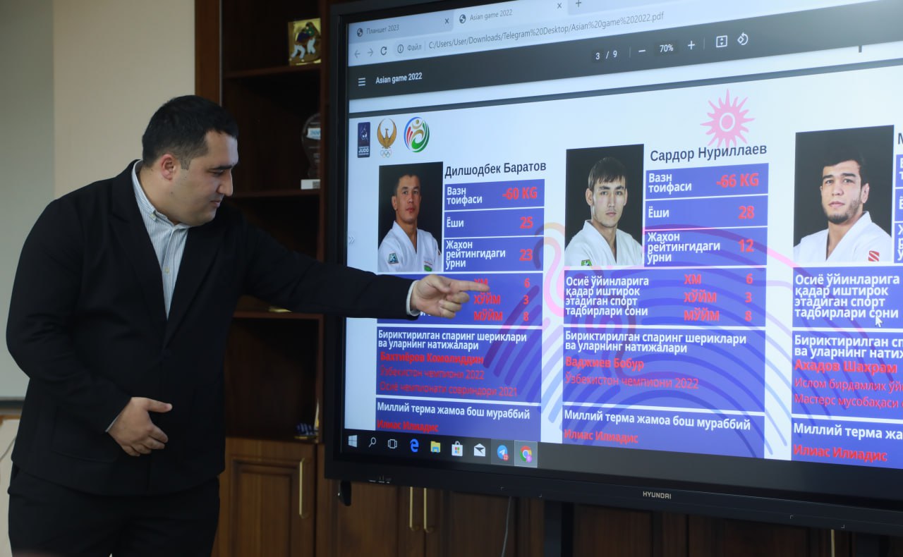 Oʻzbekiston dzyudo federatsiyasi bilan oʻtgan yigʻilish ham qizgʻin munozaralarga boy boʻldi. Ayni paytda terma jamoa 2 tarkibga boʻlingan holda litsenzion musobaqalarda ishtirok etmoqda. Bu har bir vazndagi ichki raqobatni yanada kuchaytirish, xalqaro maydondagi natijalarni ham yaxshilashga katta turtki beradi. Rejaga koʻra, terma jamoa yaqinlashib kelayotgan Osiyo va Olimpiya oʻyinlarida oʻzining eng yuqori natijasini yaxshilashi kutilmoqda.