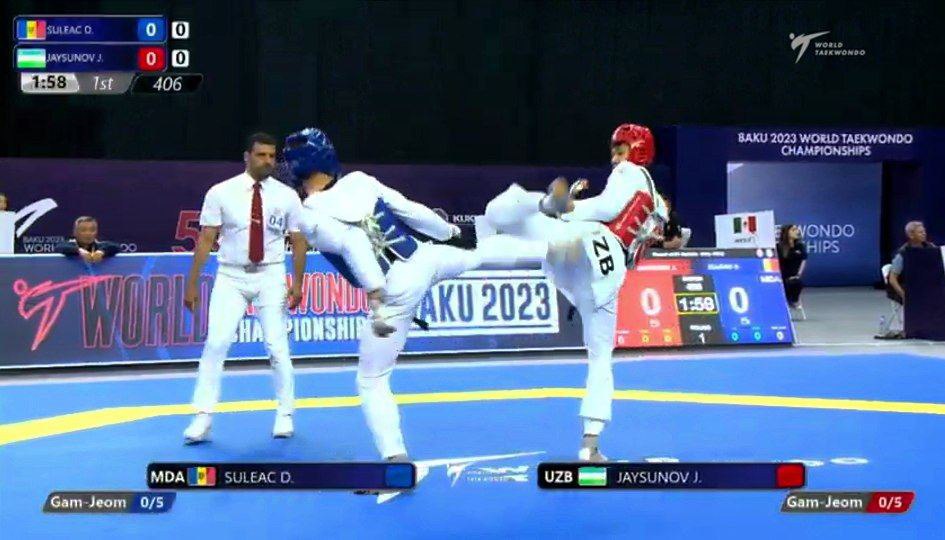 Taekvondochilarimiz jahon chempionatining oltinchi kun dasturidagi ishtiroklarini boshlashdi. -74 kg vazn toifasida bahs olib borgan Jasur Jaysunov ilk davrada moldovalik Dmitriy Suyelakni 2 raundda katta qiyinchiliksiz magʻlubiyatga uchratib, keyingi bosqichga yoʻl oldi.