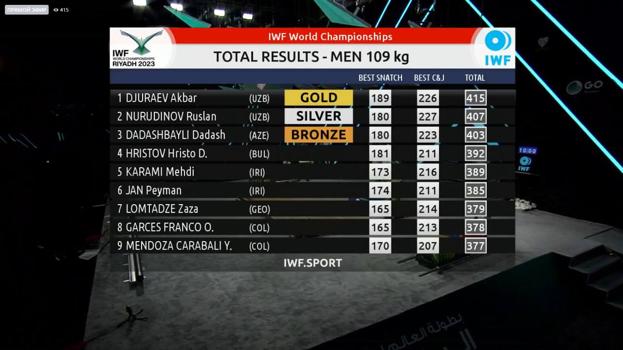 O’zbek og’ir atletikasi hamon -109 kg vazn toifasida jahonda tengsiz ekani yana bir karra o’z isbotini topdi. Hamyurtlarimiz, Olimpida chempionlari Akbar Jo’rayev hamda Ruslan Nurudinov ushbu vazn toifasida jahon chempionatining oltin va kumush medallarni bo’lishib olishdi.