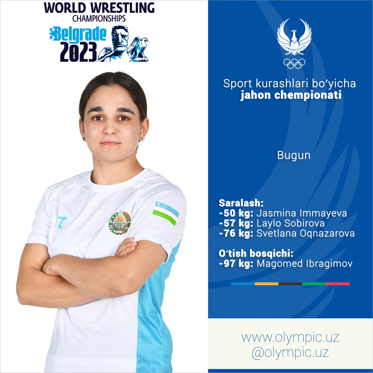 Belgrad shahrida (Serbiya) sport kurashlari boʻyicha jahon chempionati davom etadi. Bugun ayollar kurashi dasturida 3 nafar sportchimiz saralash bosqichida ishtirok etsa, erkin kurashchimiz Magomed Ibragimov bronza medali uchun oʻtish bellashuvida gilamga chiqadi. Yurtdoshlarimizning bu boradagi ilk raqiblari bilan tanishing: