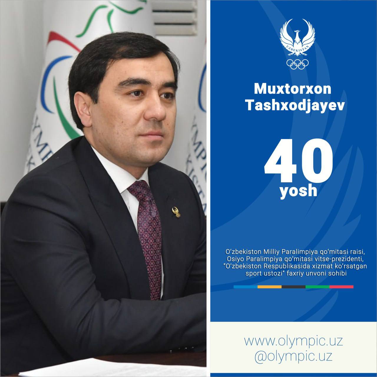 Bugun Oʻzbekiston Milliy Paralimpiya qoʻmitasi raisi, Osiyo Paralimpiya qoʻmitasi vitse-prezidenti, “Oʻzbekiston Respublikasida xizmat koʻrsatgan sport ustozi” faxriy unvoni sohibi Muxtorxon Tashxodjayev tugʻilgan kunini nishonlamoqda. Oʻzbekiston Milliy Olimpiya qoʻmitasi Muxtorxon Maxsudovichni ushbu ayyom bilan tabriklab, unga uzoq umr, sihat-salomatlik tilab qoladi.