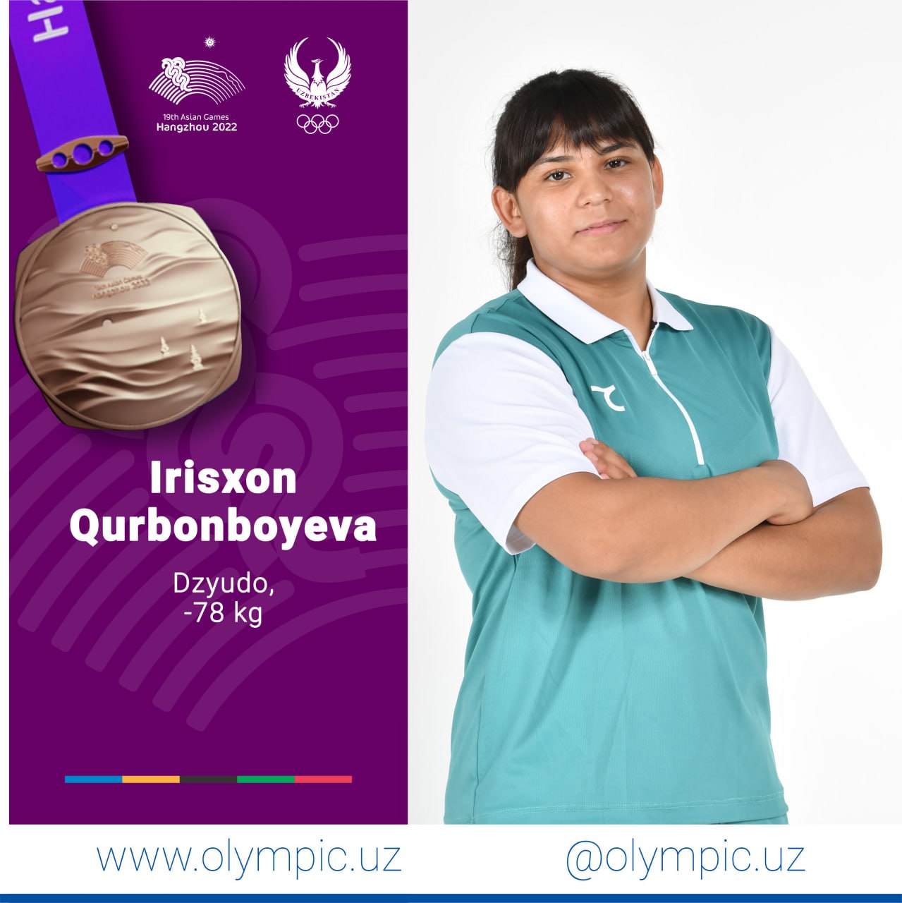 Dzyudochilarimizdan yana bir medal. Irisxon Qurbonboyeva -78 kg vazn toifasining bronza medaliga sazovor boʻldi. Hamyurtimiz uchinchi oʻrin uchun bahsda moʻgʻulistonlik Xuslen Otgonbayarni magʻlub etdi.