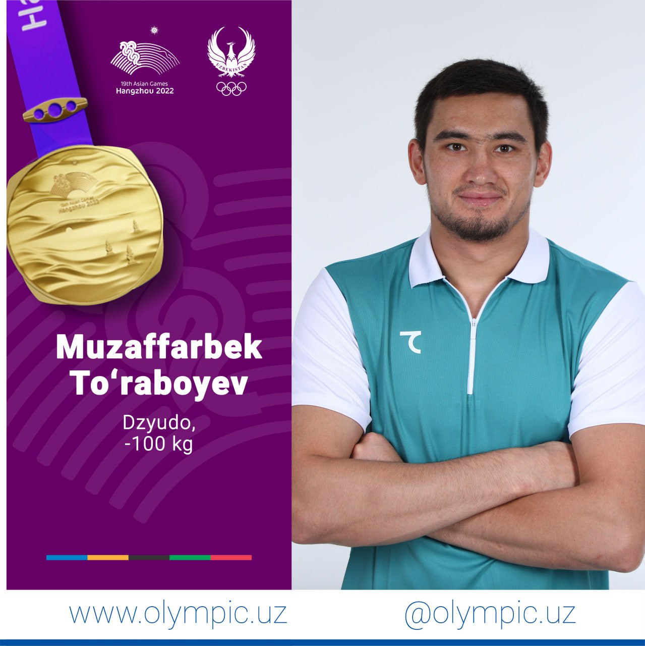Oʻzbekiston delegatsiyasi gʻaznasi yana bir oltin medal bilan boyidi. Bayroqdorimiz Muzaffarbek Toʻraboyev dzyudo boʻyicha -100 kg vazn toifasida chempionlikni qoʻlga kiritib, ushbu Osiyo oʻyinlaridagi beshinchi oltin medalimizni keltirdi. Hamyurtimiz qiziqarli kechgan final bahsida moʻgʻulistonlik Gonchigsuren Batxuyagni magʻlubiyatga uchratdi.