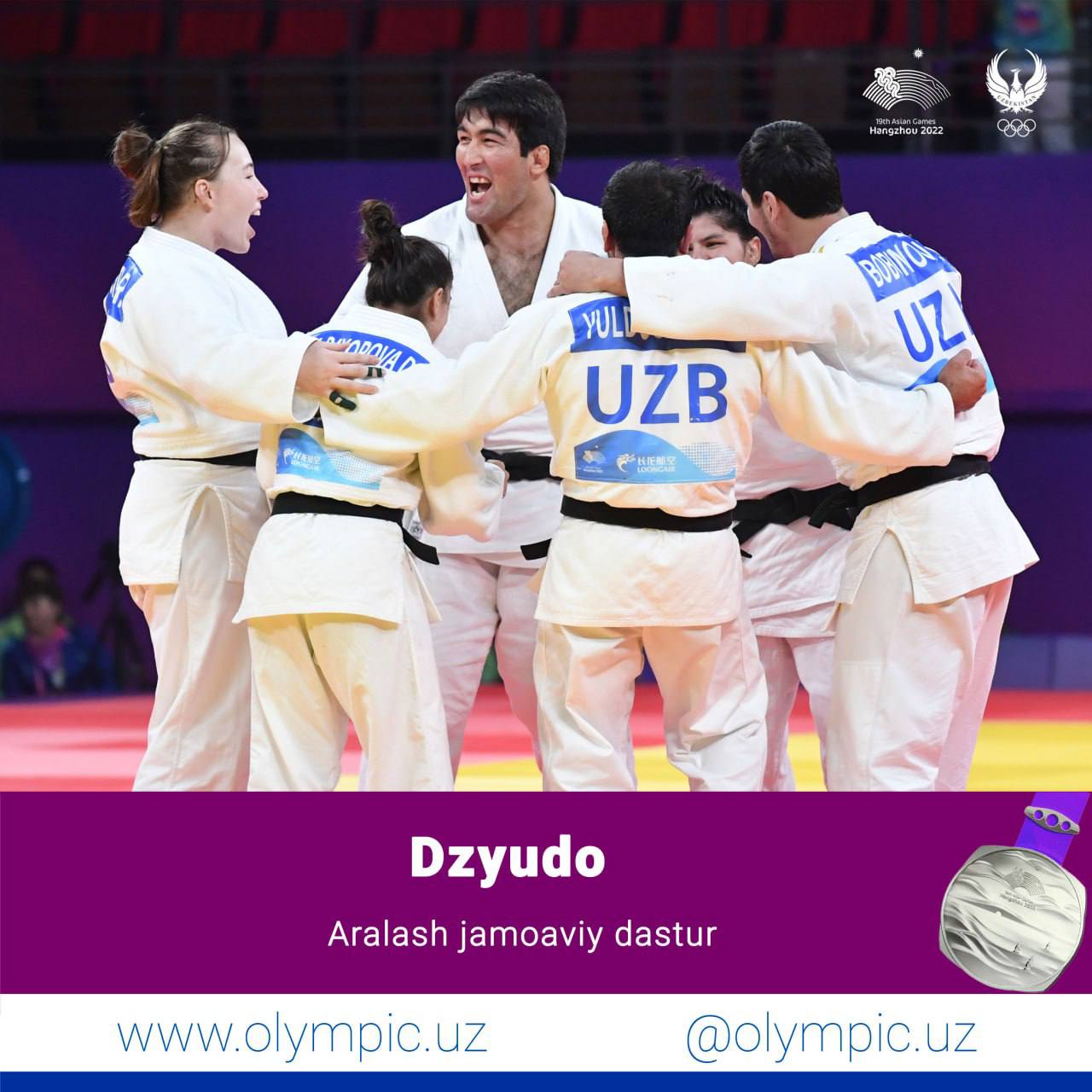 O’zbekiston delegatsiyasida navbatdagi medal. Dzyudo bo’yicha aralash jamoaviy dasturda hamyurtlarimiz kumush medalni qo’lga kiritishdi. Finalda ushbu sport vatani Yaponiya bilan bahs olib borgan jamoamiz imkoniyatni boy berib, Osiyo o’yinlarini ikkinchi o’rinda yakunladi.
