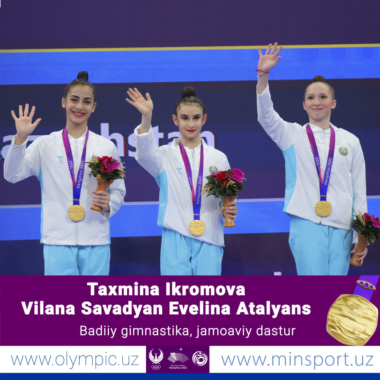 Bugundan bellashuvlarga kirishgan badiiy gimnastika boʻyicha Oʻzbekiston terma jamoasi aʼzolari yakkalik dasturida saralash va jamoaviy yoʻnalish boʻyicha final bahslarini oʻtkazishdi. Taxmina Ikromova, Vilana Savadyan hamda Evelina Atalyansdan iborat jamoamiz 324.8 ball jamgʻarishga erishdi. Quvonarlisi, ushbu natijani hech bir jamoa takrorlay olmadi va hamyurtlarimiz jamoaviy dasturda oltin medalni qoʻlga kiritishdi.