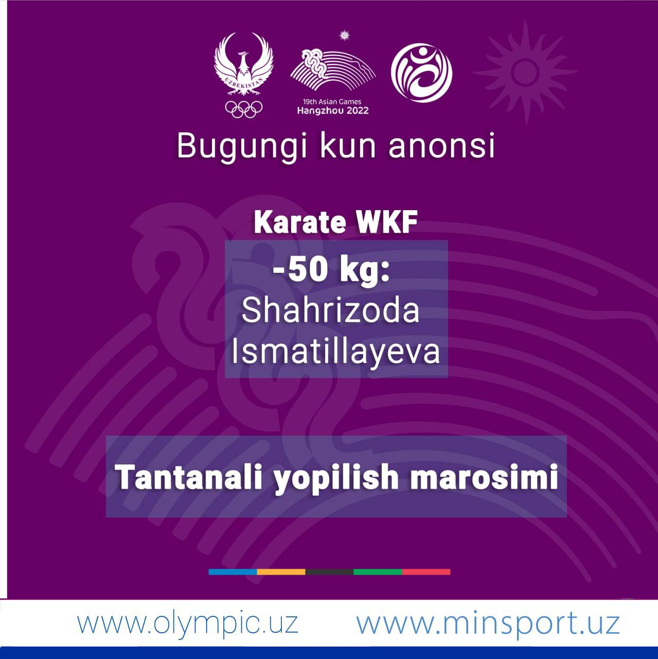Bugun Xanchjou-2022 XIX yozgi Osiyo oʻyinlari oʻz yakuniga yetadi. Ushbu kun dasturida karate WKF boʻyicha Oʻzbekiston terma jamoasi aʼzosi Shahrizoda Ismatillayeva (-55 kg) yurtimiz sharafini himoya qiladi. Shuningdek, kechki dasturda musobaqaning tantanali yopilish marosimi oʻtkaziladi.