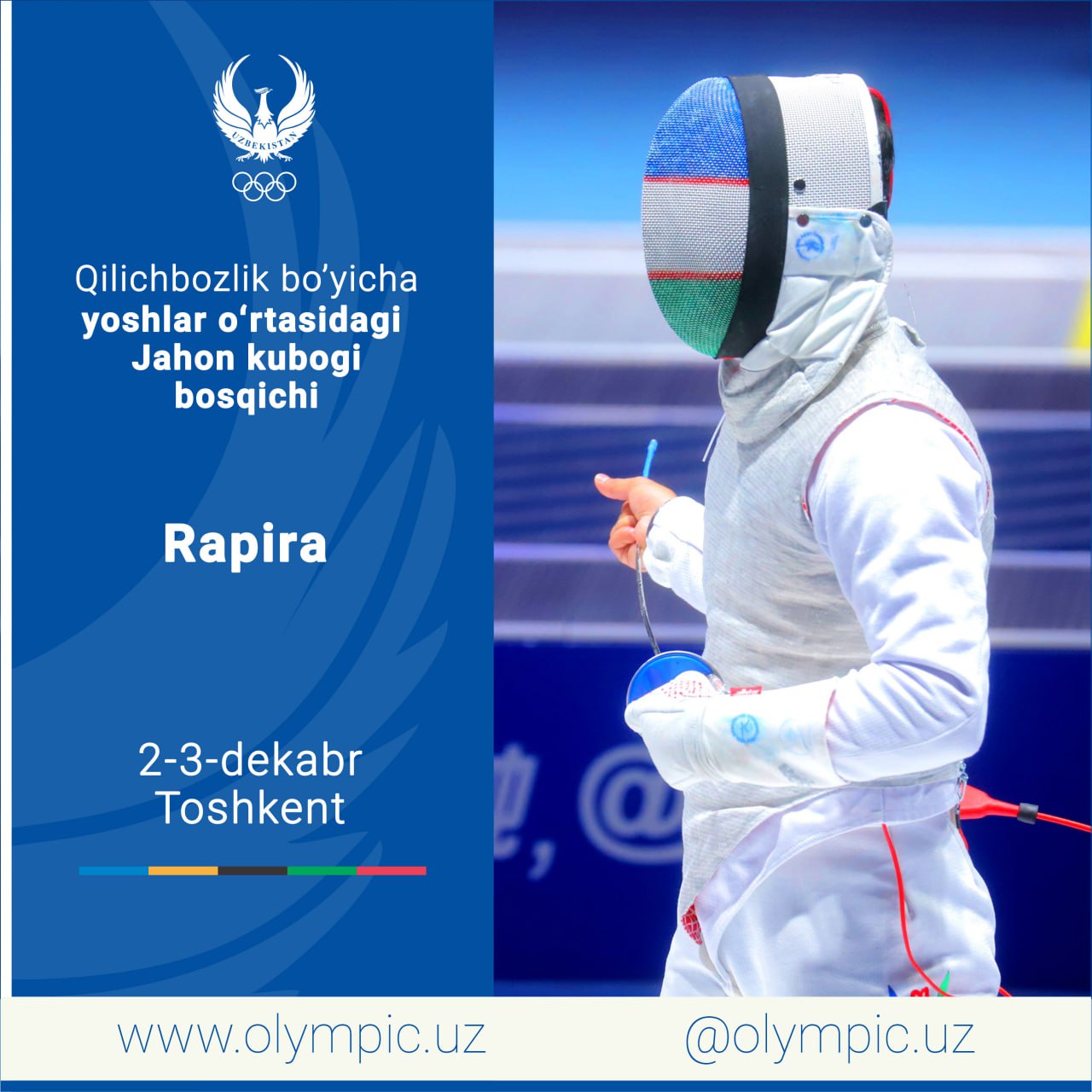 Qilichbozlik boʻyicha yoshlar oʻrtasidagi Jahon kubogining navbatdagi bosqich bellashuvlari yaqinlashib kelmoqda. Eʼtiborlisi, 2-3-dekabr kunlari oʻtadigan bahslarga Toshkent shahri mezbonlik qiladi.