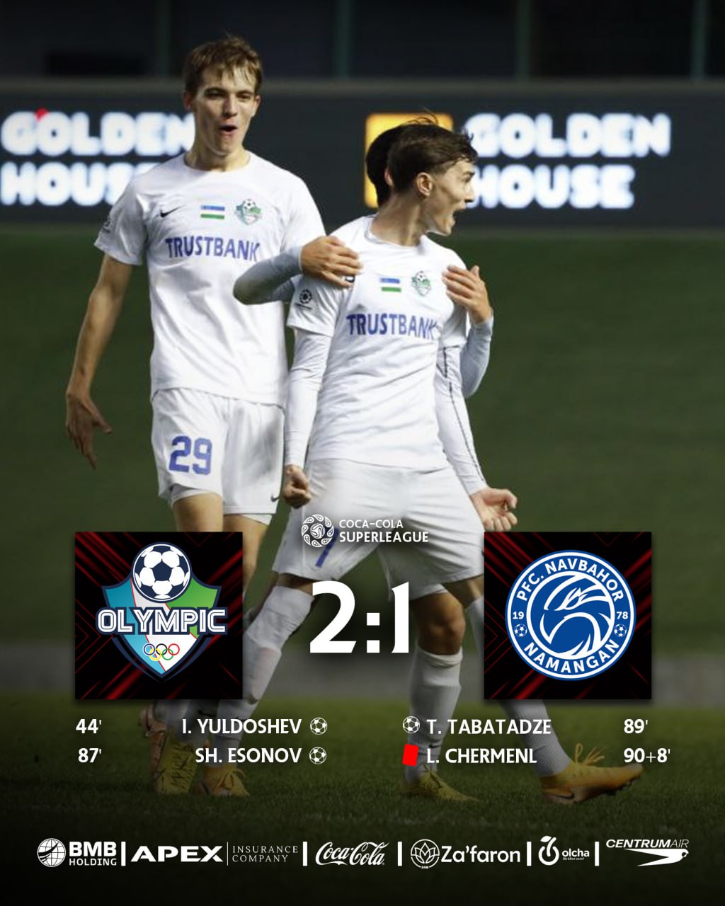 “Olimpiyachilar” navbatdagi gʻalabani qoʻlga kiritishdi. Bu gal turnir jadvalida chempionlik uchun kurash olib borayotgan Namanganning “Navbahor” klubi qiziqarli oʻyinda 2:1 hisobida magʻlub etildi. Ushbu gʻalabadan keyin “Olimpik”ning ochkolari soni 31 taga yetdi.