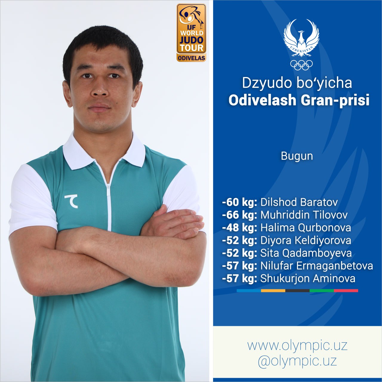 Bugun Portugaliyada dzyudo boʻyicha yilning ilk turniri – Odivelash Gran-prisi start oladi. Dunyoning 90 mamlakatidan 624 nafar sportchi ishtirokida kechadigan musobaqada Oʻzbekiston terma jamoasi aʼzolari ham qatnashishi haqida maʼlum qilgan edik. Anʼanaga muvofiq, bugun musobaqani yengil vazn toifasidagi sportchilar boshlab berishadi. Kun davomida medallar uchun kurash olib boradigan hamyurtlarimiz va ularning ilk raqiblari bilan tanishing: