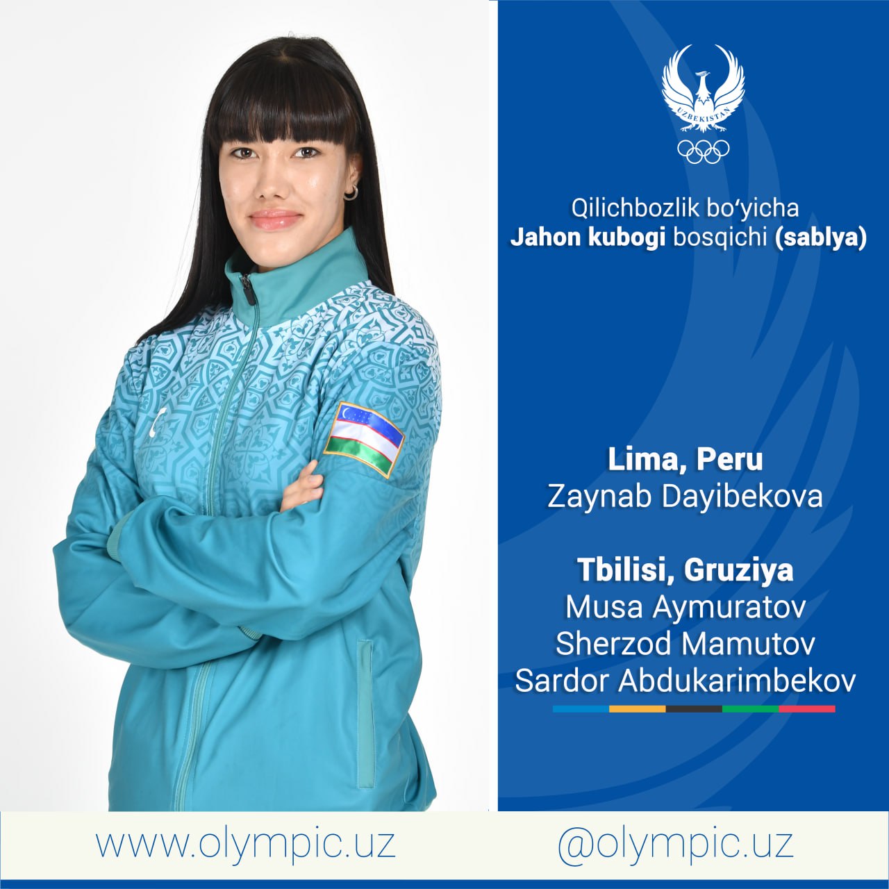 Qilichbozlik boʻyicha Oʻzbekiston terma jamoasi aʼzolari bugundan nufuzli musobaqalardagi ishtiroklarini boshlashadi. Sablyachilarimiz Zaynab Dayibekova Peru, Musa Aymuratov, Sherzod Mamutov hamda Sardor Abdukarimbekov Gruziya mezbonlik qiladigan Jahon kubogi bosqichida medallar uchun bahslarga kirishadi.