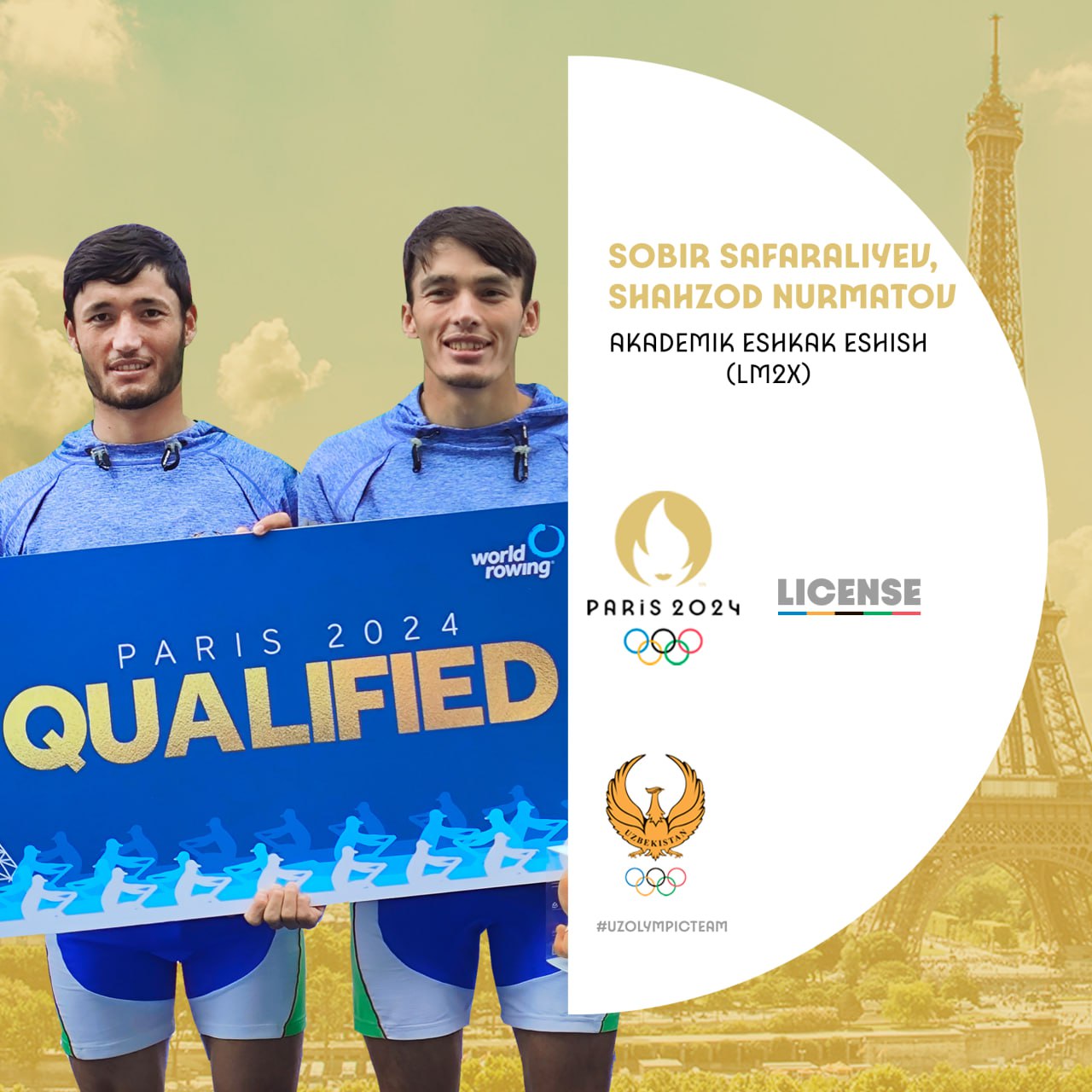 Akademik eshkak eshish boʻyicha Oʻzbekiston terma jamoasi aʼzolari Shahzod Nurmatov va Sobir Safaraliyev juftligi ham oʻz nomini Parij-2024 yozgi Olimpiya oʻyinlari qatnashchilari orasiga kiritib qoʻyishgan. Osiyo oʻyinlarida shohsupaga koʻtarilgan ushbu atletlarimizdan Fransiyada ham yuqori natija kutamiz.