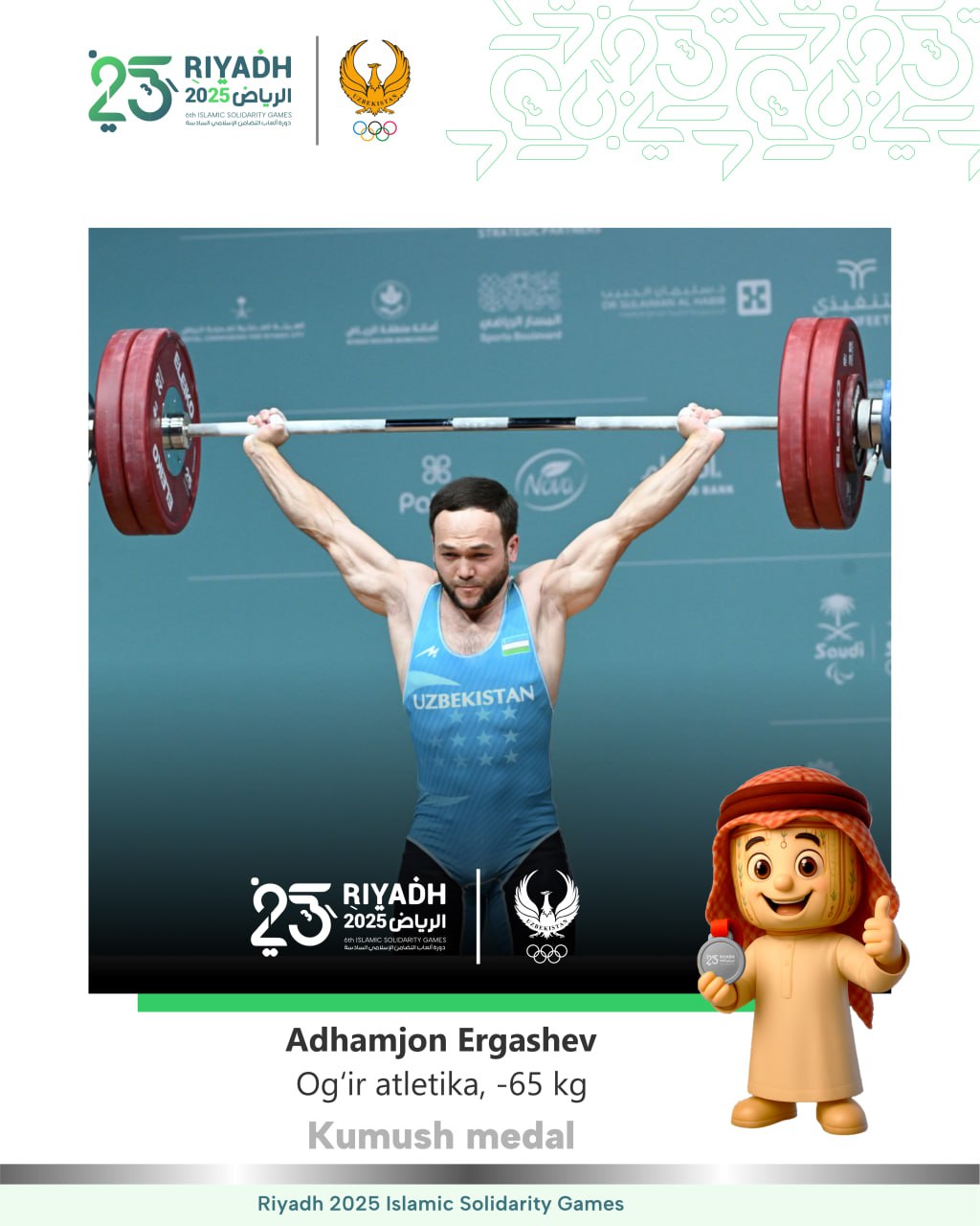 Oʻzbekiston delegatsiyasi gʻaznasi yana ikkita medal bilan boyidi. Ogʻir atletikachimiz Adhamjon Ergashev (-65 kg) siltab koʻtarish mashqida 170 kg bilan oltin, ikki kurash hisobida esa 304 kg bilan kumush medalni qoʻlga kiritdi.