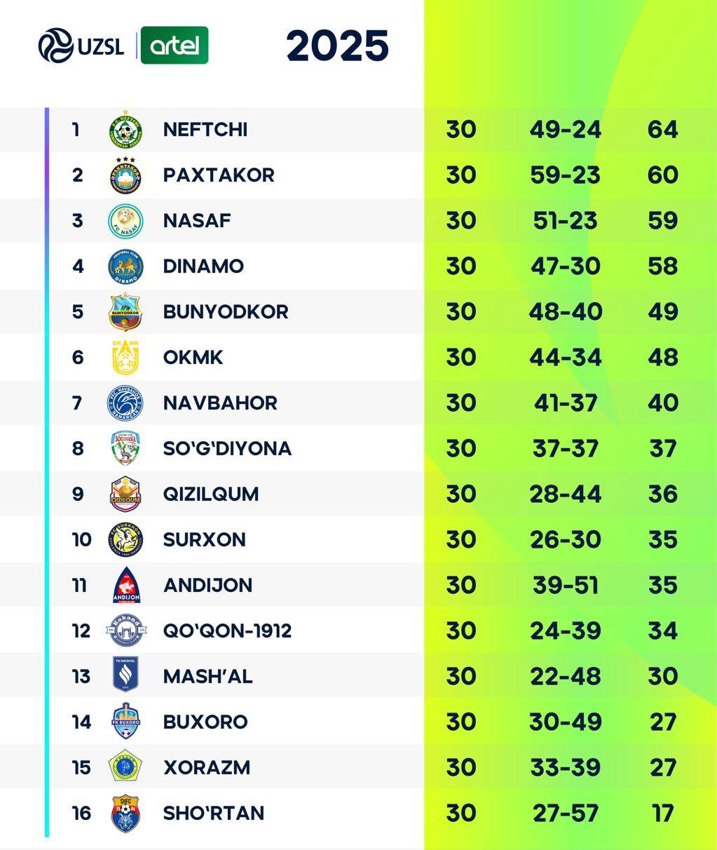 Bugun futbol boʻyicha Oʻzbekiston Superligasining 2025-yilgi mavsumi nihoyasiga yetdi. Ortda qolgan 30 tur yakuniga koʻra, Fargoʻnaning “Neftchi” jamoasi uzoq yillik tanaffusdan keyin yana bir bor chempionlikni qoʻlga kiritgan boʻlsa, “Paxtakor” kumush, “Nasaf” esa bronza medallari bilan taqdirlandi.