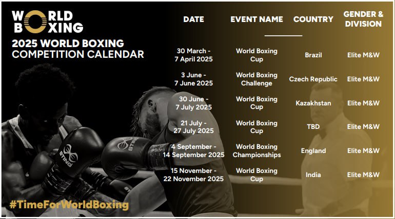 World Boxing tashkiloti 2025-yil uchun musobaqalar taqvimini eʼlon qildi. Unda 4 ta Jahon kubogi bos…