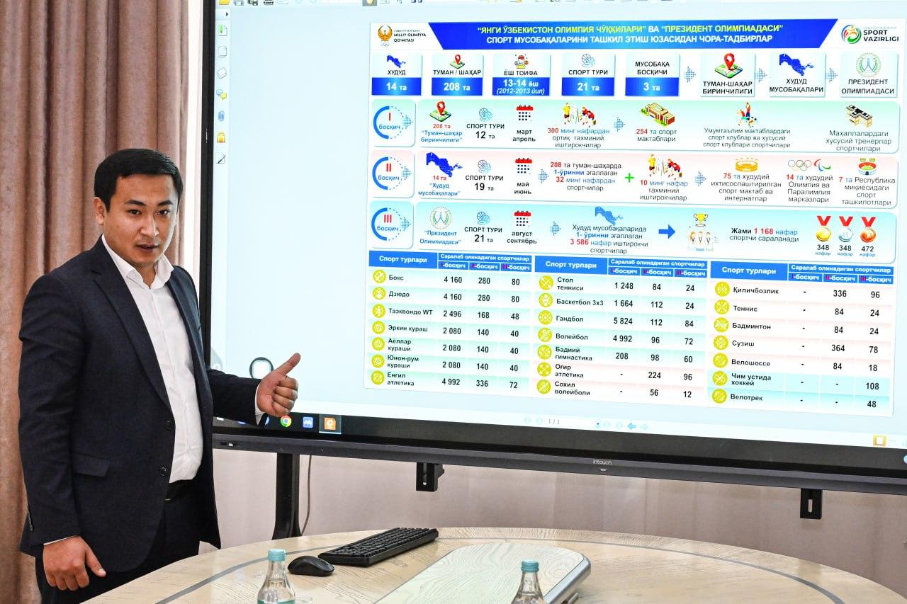 Bugun Sport vazirligi hamda O‘zbekiston Milliy Olimpiya qo‘mitasi rahbariyati ishtirokida “Prezident Olimpiadasi” o‘yinlarining yangi mavsumi va yaqin davrda o‘tkazilishi rejalashtirilgan yirik sport musobaqalariga tayyorgarlik masalalariga bag‘ishlangan yig‘ilish bo‘lib o‘tdi. Unda oʻyinlarning tashkiliy jihatlari, hududlardagi saralash bosqichlarini samarali o‘tkazish, infratuzilma va moddiy-texnik bazani tayyorlash, shuningdek, sportchilar uchun munosib sharoitlar yaratish yuzasidan aniq vazifalar belgilab olindi. Shu bilan birga, musobaqalarning shaffof va adolatli o‘tishini ta’minlash, joriy yilgi kompleks musobaqalarda qatnashadigan terma jamoalar uchun barcha qulayliklarni yaratish masalalari muhokama qilindi.