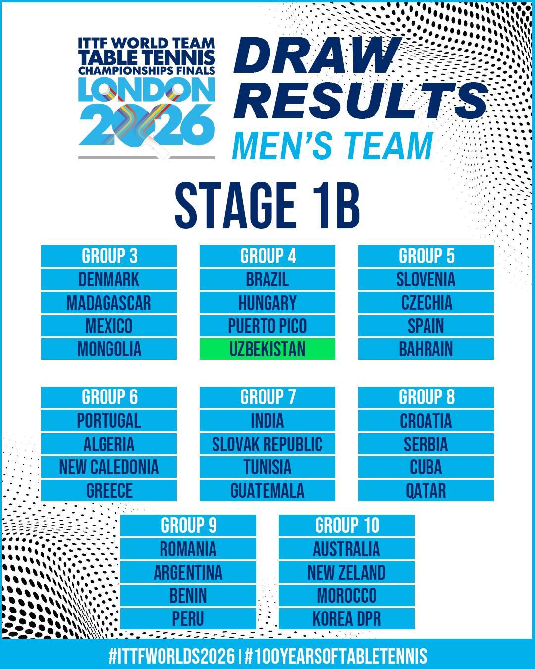 28-aprel – 10-may kunlari Angliyaning poytaxti stol tennisi boʻyicha jamoaviy yoʻnalishdagi jahon chempionatiga mezbonlik qiladi. Unda ishtirok etadigan Oʻzbekiston erkaklar va ayollar terma jamoalari guruh bosqichidagi raqiblarini bilib olishdi. Qurʼaga koʻra, hamyurtlarimiz musobaqaning ilk bosqichida quyidagi jamoalarga qarshi bahs olib borishadi: