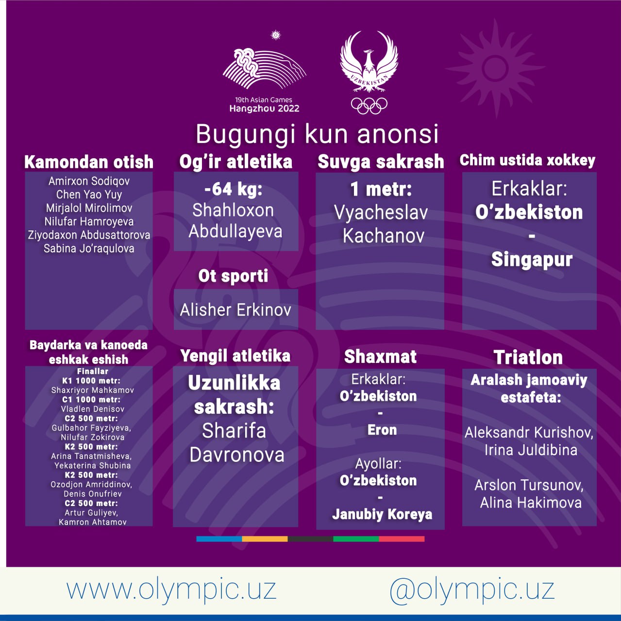 Bugun ham Xanchjou-2022 XIX yozgi Osiyo o’yinlarida bir qator qiziqarli bellashuvlar kutib turibdi. ...