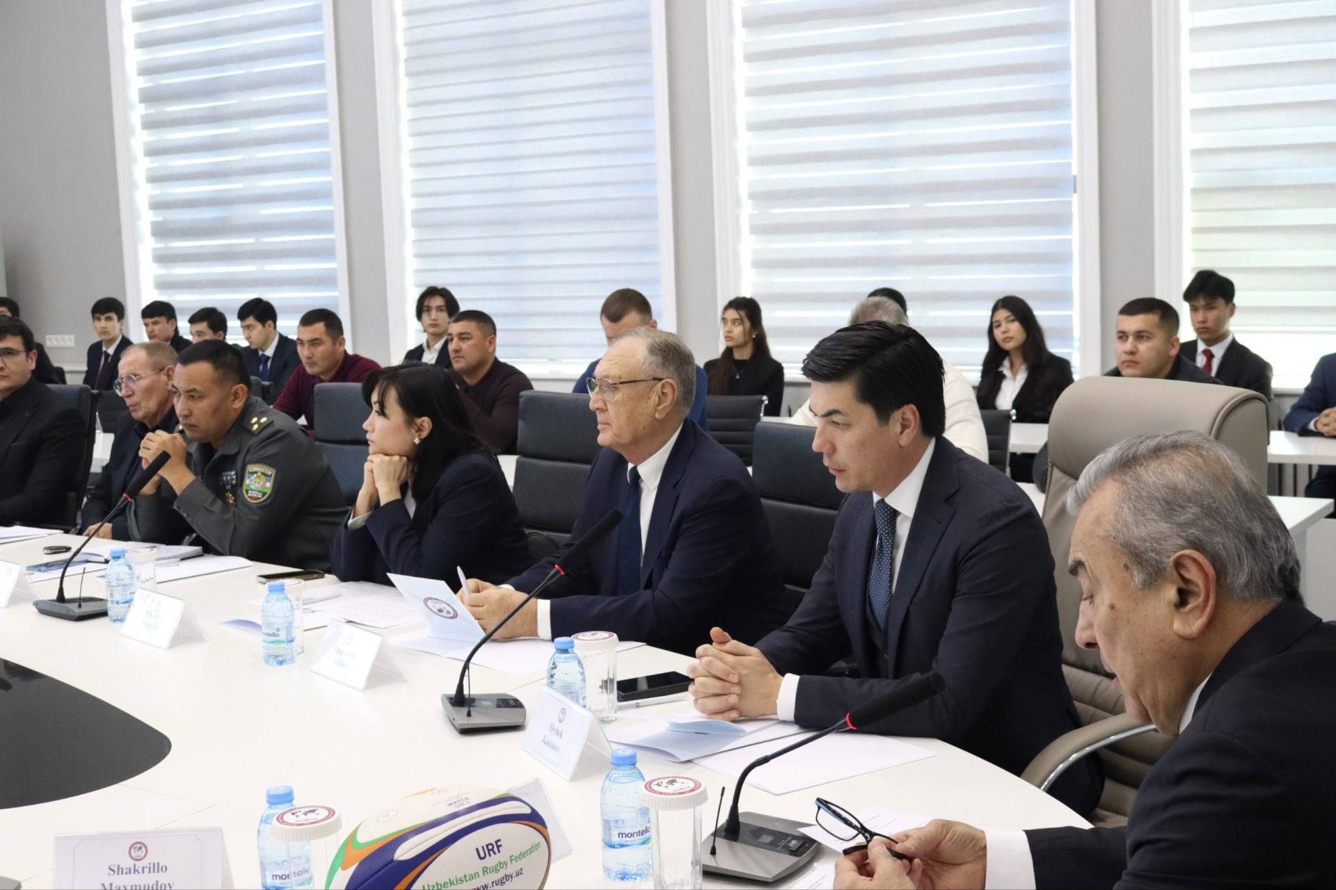 Jahon iqtisodiyoti va diplomatiya universitetining majlislar zalida Oʻzbekiston regbi federatsiyasin...