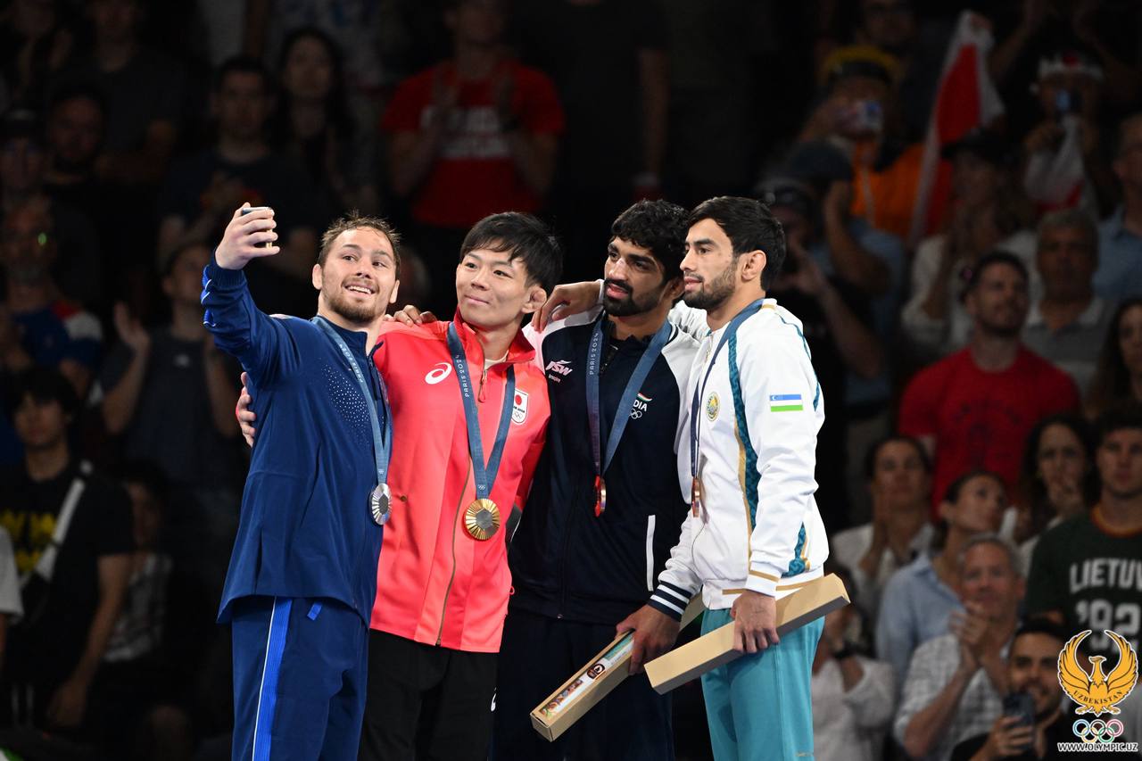 Бронзовый призёр Париж-2024 по вольной борьбе Гуломжон Абдуллаев на Олимпийском пьедестале