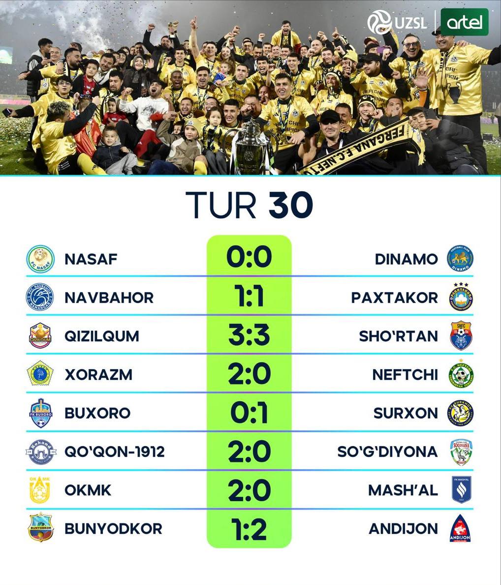 Завершился сезон 2025 года Суперлиги Узбекистана по футболу. По результатам 32 туров «Нефтчи» из Фер…