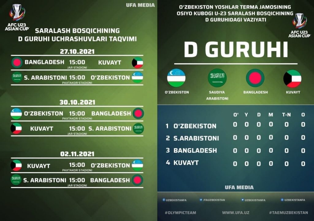 В этом отборочном раунде наша группа также состояла из Саудовской Аравии, Кувейта и Бангладеш. Честь нашей сборной на турнире будут защищать представители поколения, созданного для Олимпийских игр в Париже-2024. Стоит отметить, что основная масса игроков этой команды-19-20 лет. Календарь соревнований нашей команды выглядит следующим образом: