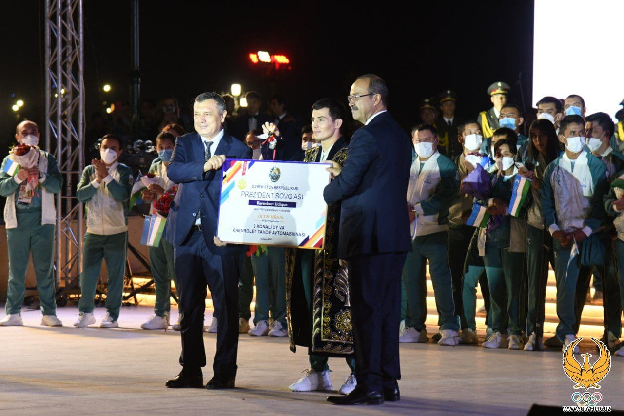 Затем, победителям Паралимпийских игр Токио-2020 были вручены подарки Президента - золотые призёры получили автомобиль “Tahoe” и трёхкомнатную квартиру, серебряные призёры - автомобиль “Traverse” и двухкомнатную квартиру, бронзовые призёры - автомобиль “Trailblazer” и однокомнатную квартиру. В конце мероприятия выступил Министр культуры Республики Узбекистан, народный артист Узбекистана Озодбек Назарбеков, который порадовал всех присутствующих своими песнями. В завершении был устроен праздничный фейерверк.