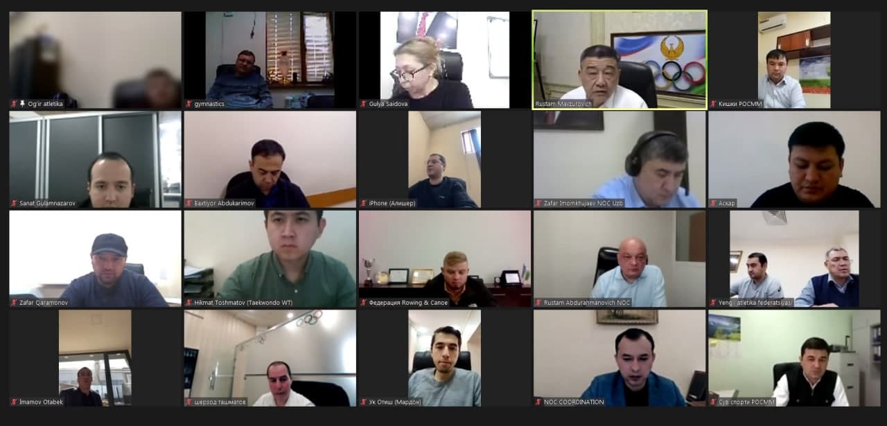 Под председательством главы НОК Рустама Шаабдурахмонова состоялось онлайн-совещание на платформе ZOOM по работе, проводимой в этой системе. В нём приняли участие руководство Министерства Туризма и спорта, Национального Олимпийского комитета, Министерства финансов, спортивных Федераций и Ассоциаций, Республиканских школ высшего спортивного мастерства. На заседании был рассмотрен ряд вопросов. В частности, были подробно обсуждены цели и задачи подготовки к предстоящим Азиатским играм в Ханчжоу и Олимпийским играм Париж-2024, а также обеспечение прозрачности работы, проводимой в системе “UzASBO”.